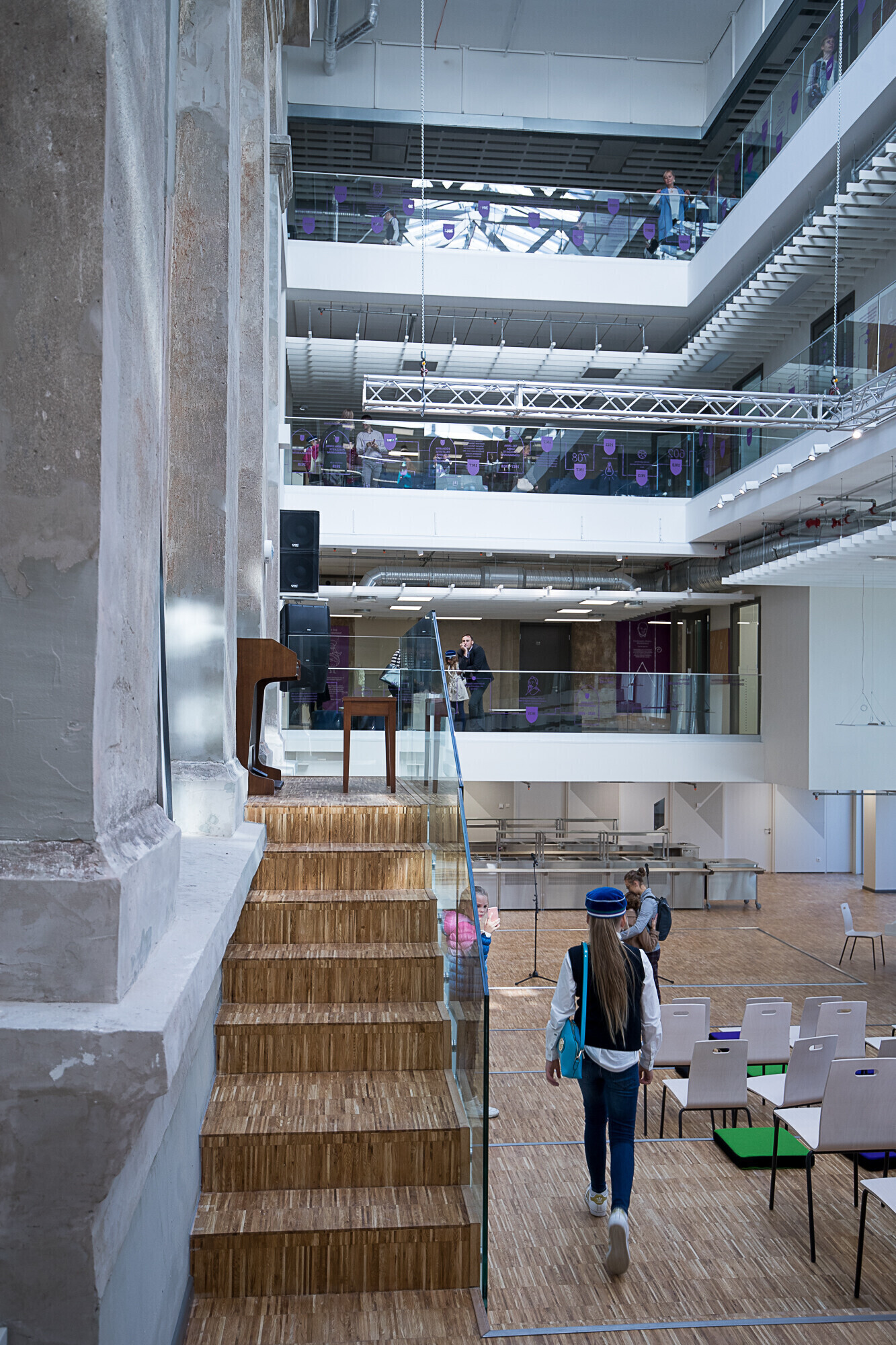 Внутри здания предусмотрены все условия для поддержания активного образа жизни школьников: дорожки для прогулок, площадки для игр и лазания. В сердце школы – атриум со ступенями, на которых можно и отдыхать, и учиться, а при необходимости – проводить мероприятия.