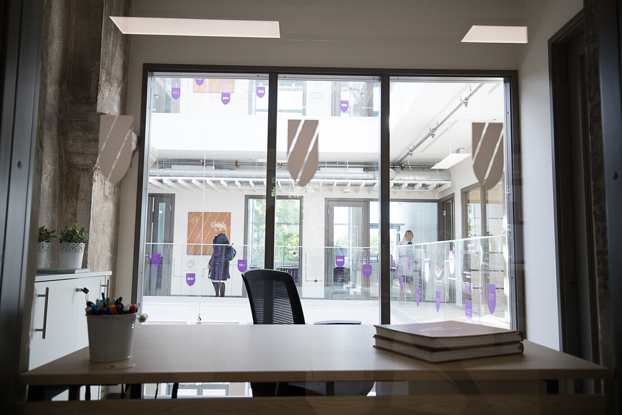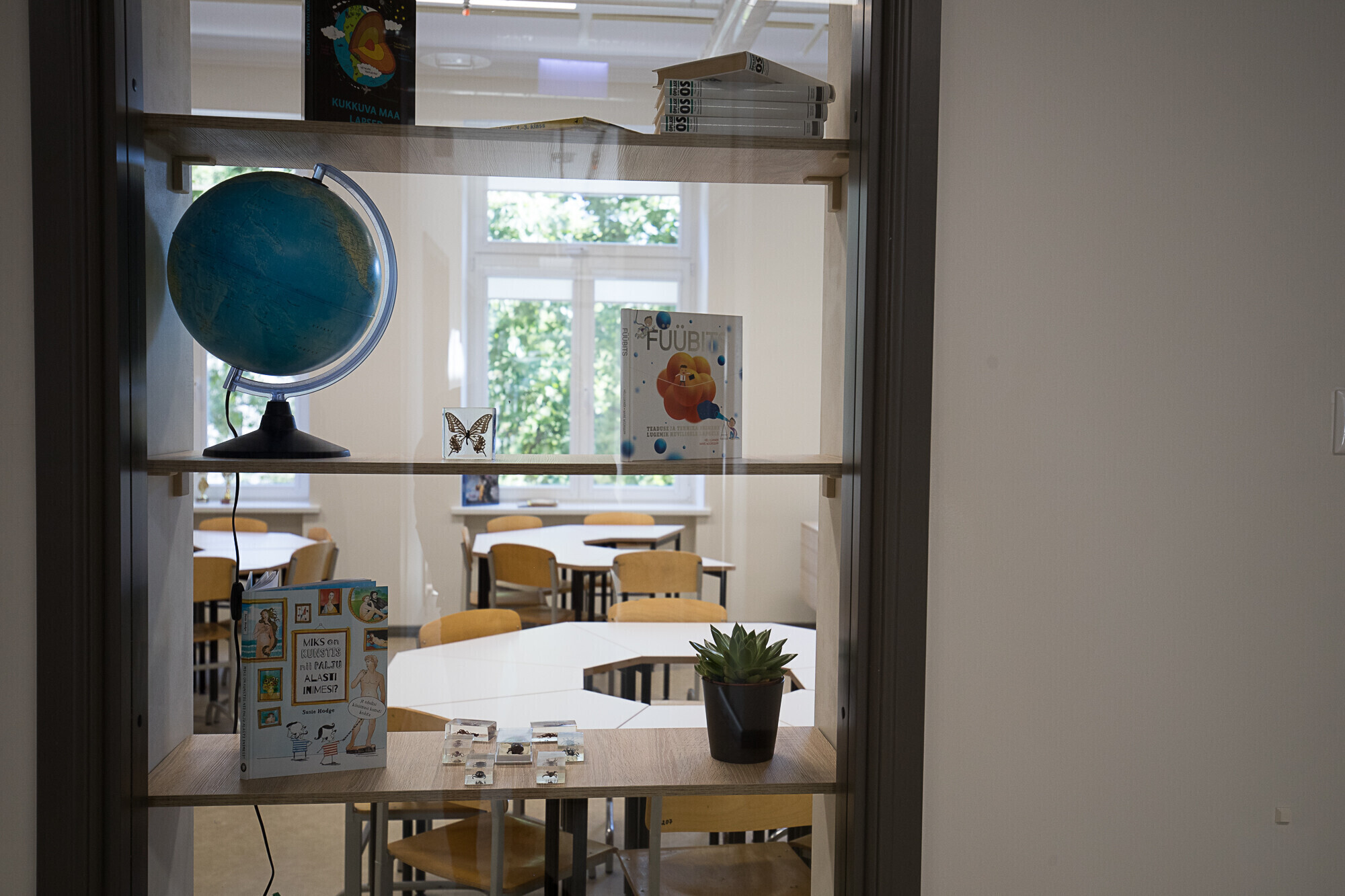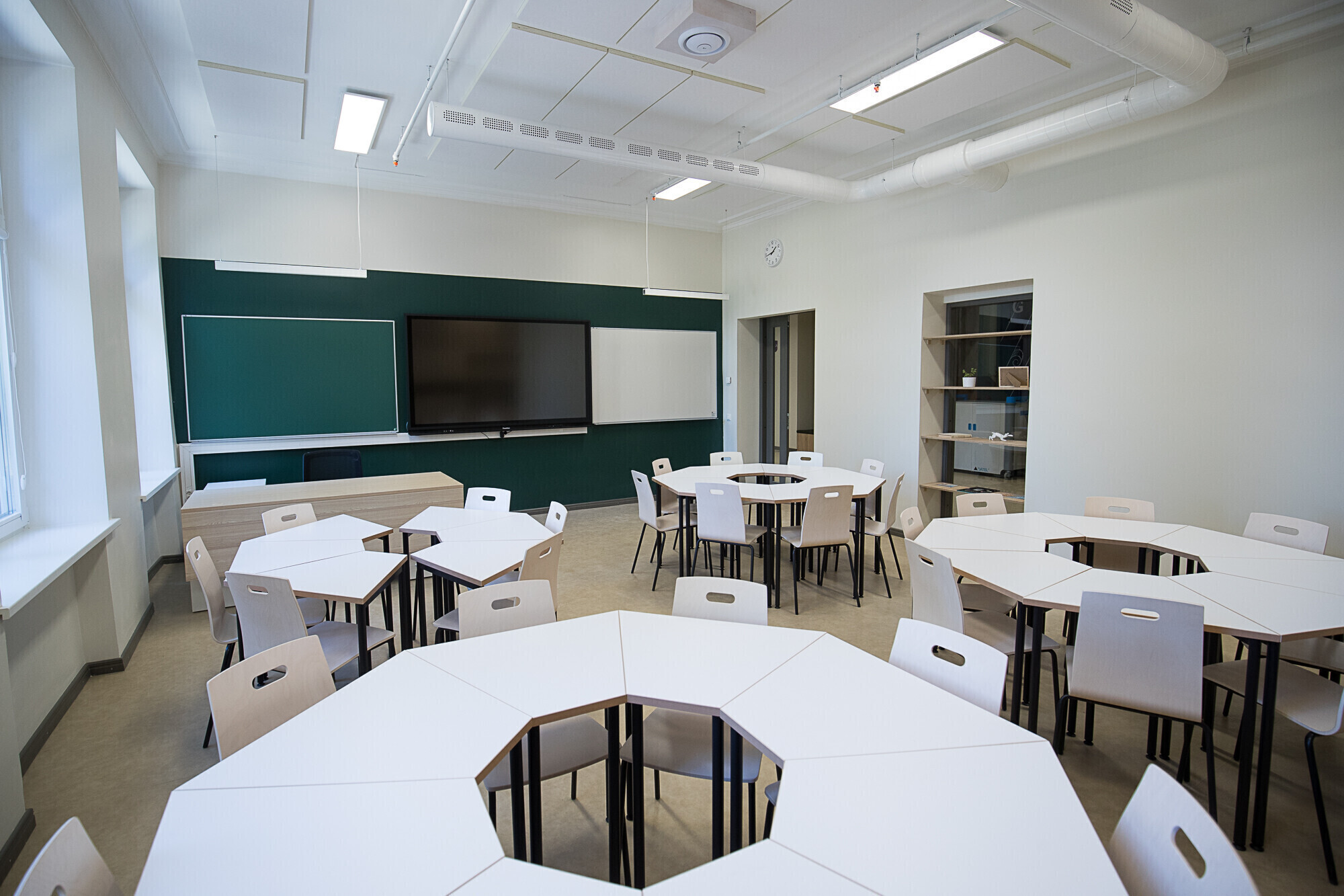 В здании 30 кабинетов, а также отдельные помещения для занятий рукоделием, изобразительным искусством, робототехникой, информатикой, музыкой, самостоятельной и групповой работы и изучения иностранных языков. Вместо библиотеки по всей школе расставлены полки с книгами, которыми могут пользоваться все желающие.