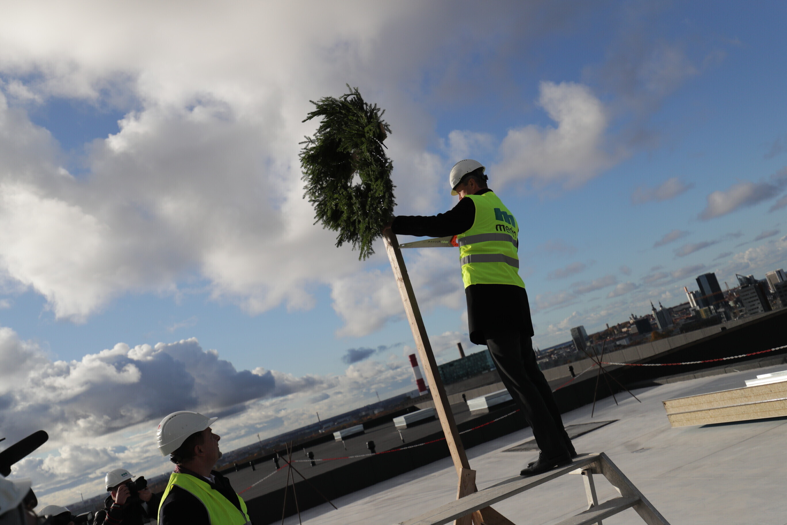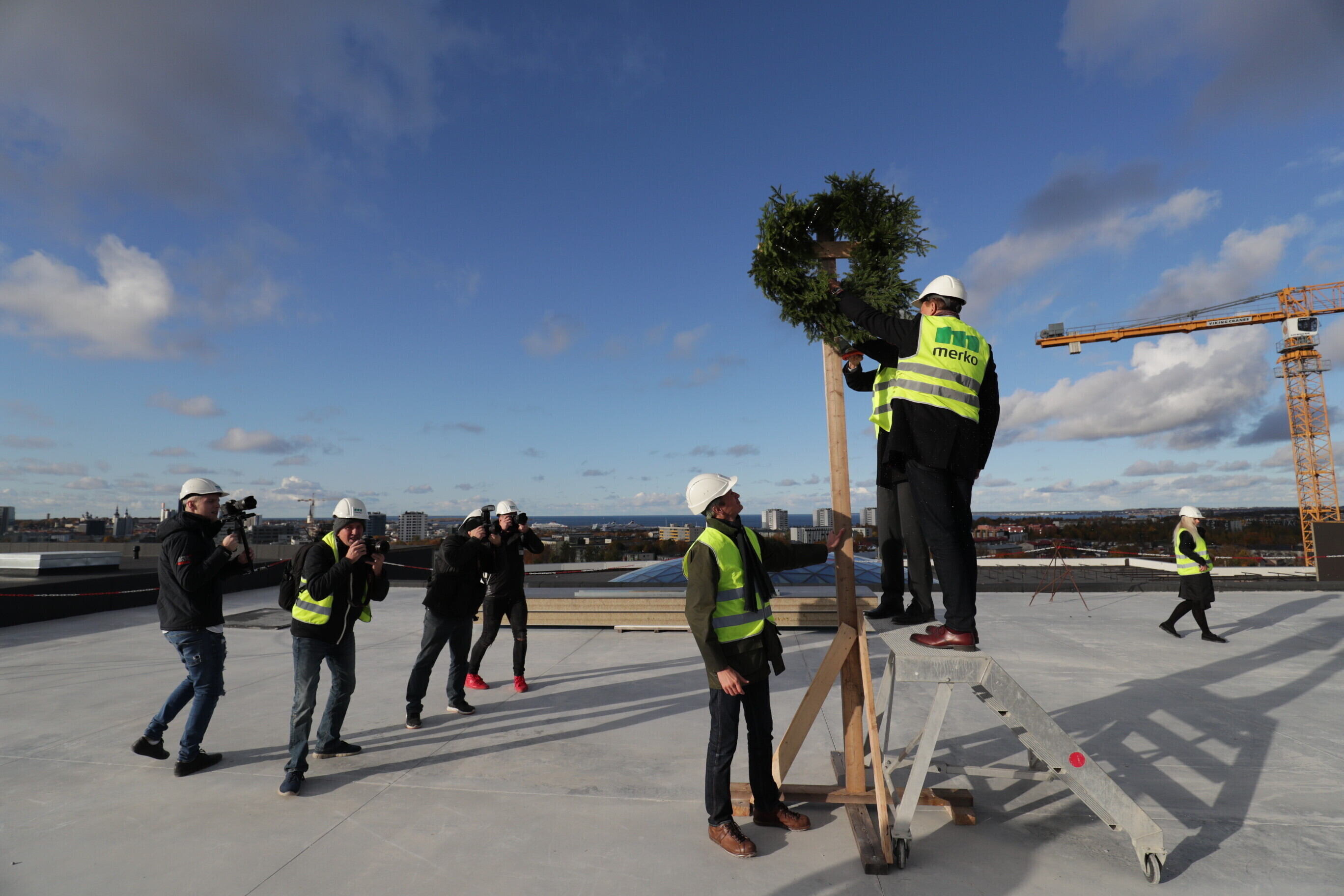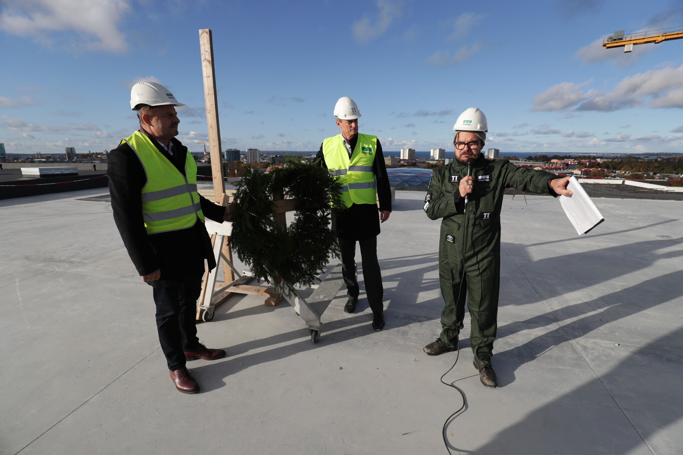 Глава компании Pro Kapital Аллан Реммелькоор и член правления Merko Ehitus Eesti Яан Мяэ водрузили венок на крыше здания, где в будущем появится единственное в своем роде в Европе колесо обозрения.