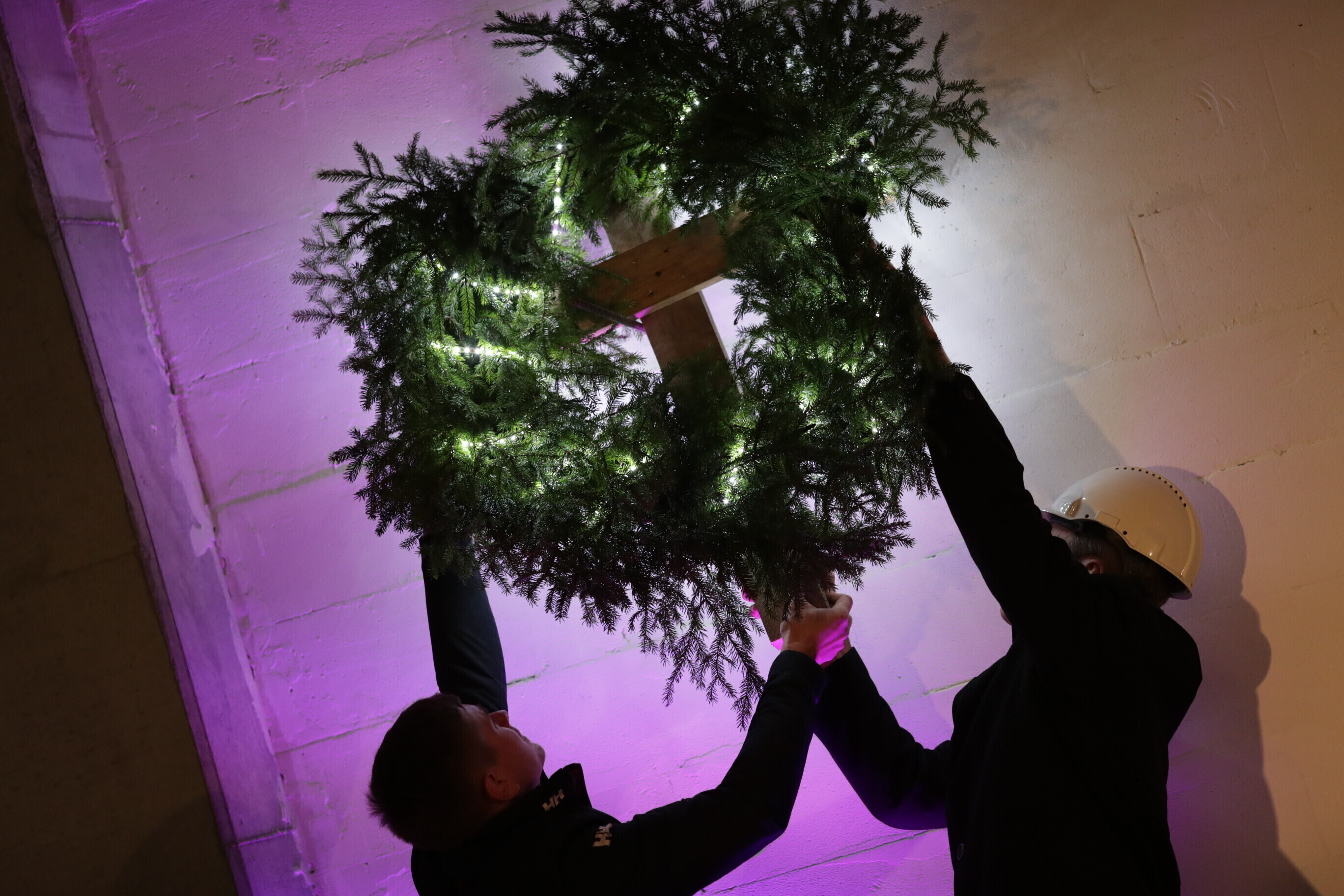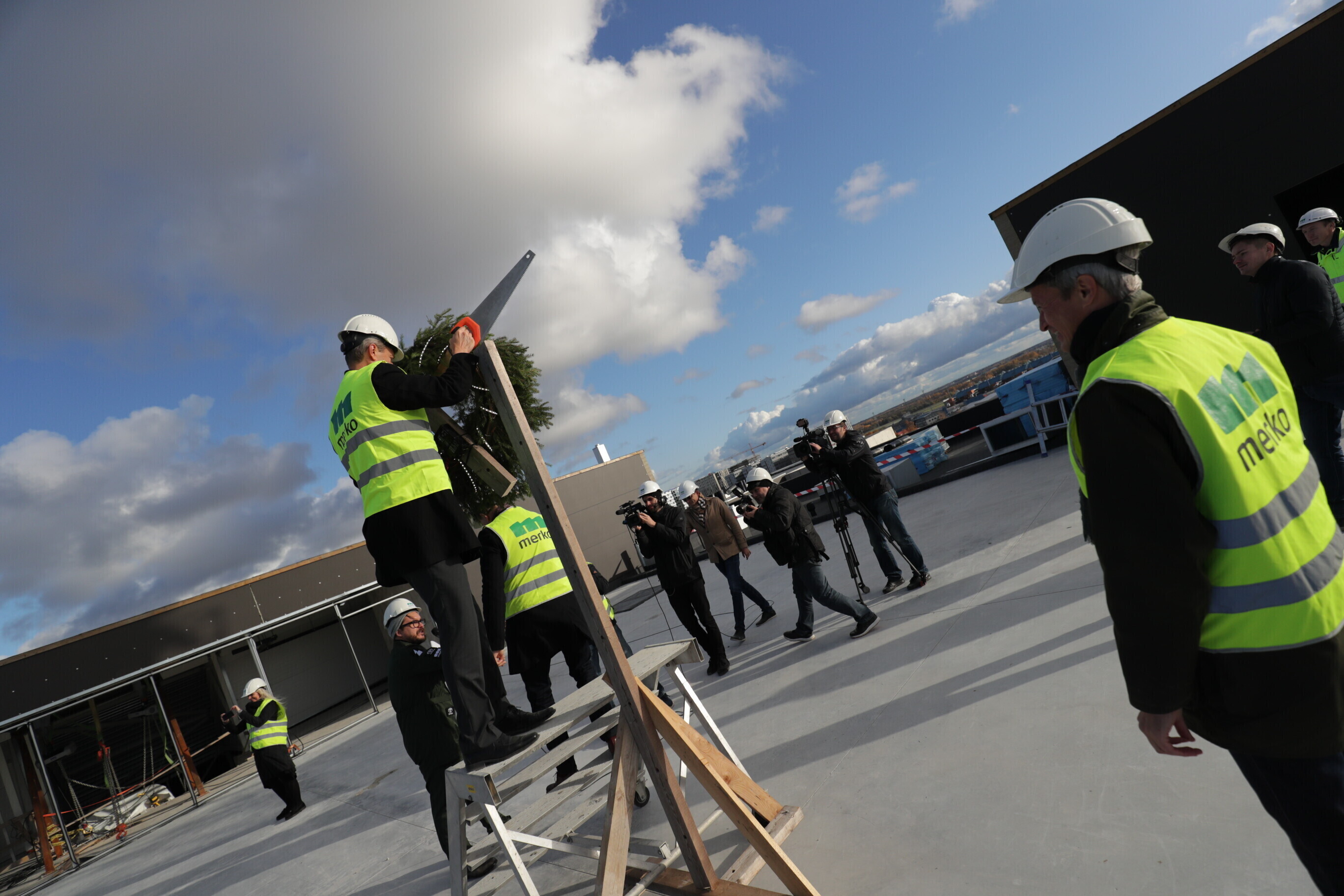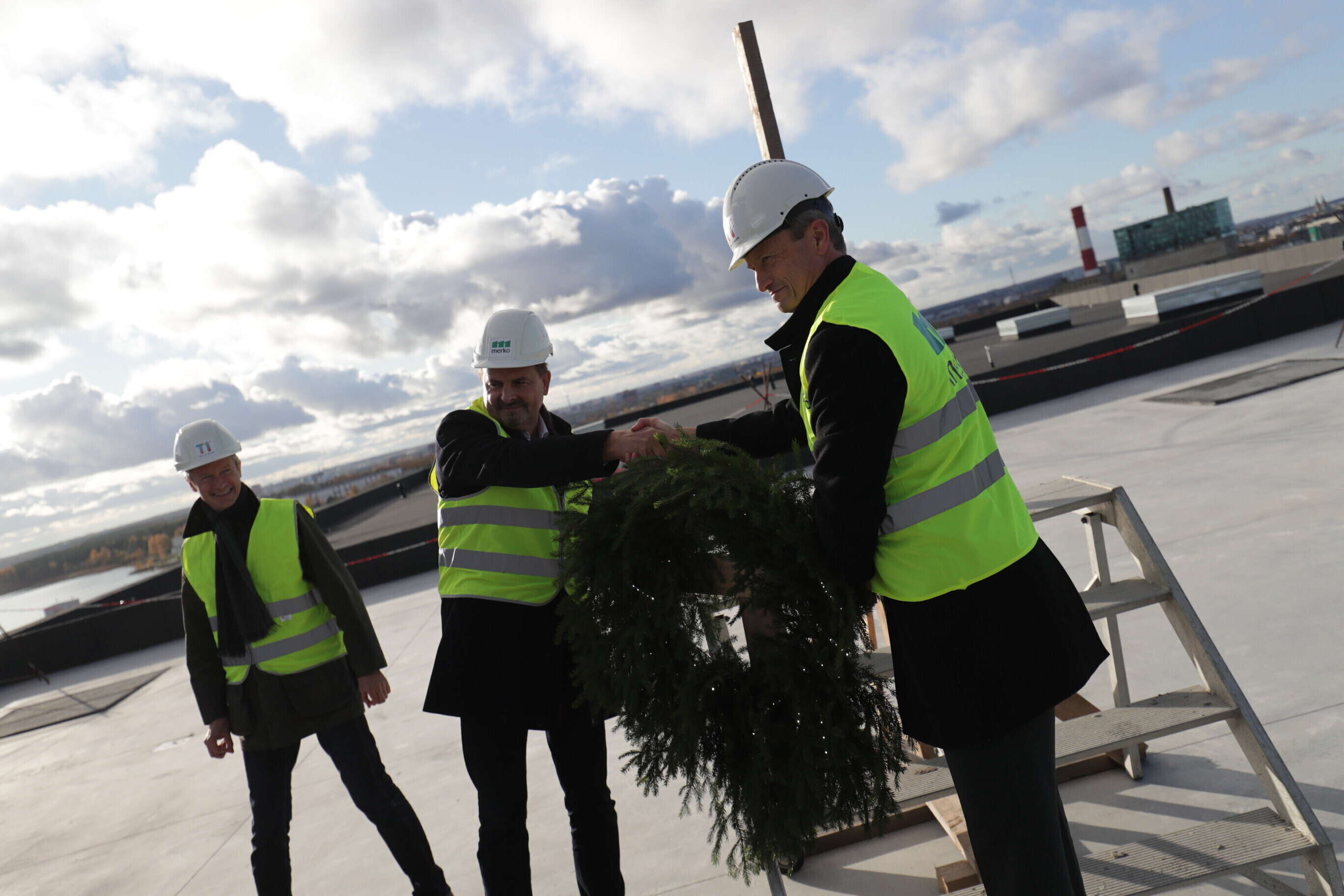 Глава компании Pro Kapital Аллан Реммелькоор и член правления Merko Ehitus Eesti Яан Мяэ водрузили венок на крыше здания, где в будущем появится единственное в своем роде в Европе колесо обозрения.