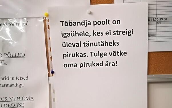 Работник Раквереского мясокомбината отправил ERR фотографию объявления, которое приглашает всех не участвующих в забастовке угоститься пирожком от благодарного работодателя.