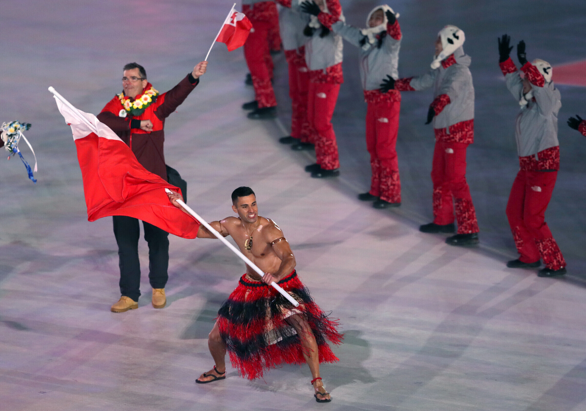Замкнули парад северокорейские и южнокорейские спортсмены под единым флагом, который пронесли сразу два знаменосца.