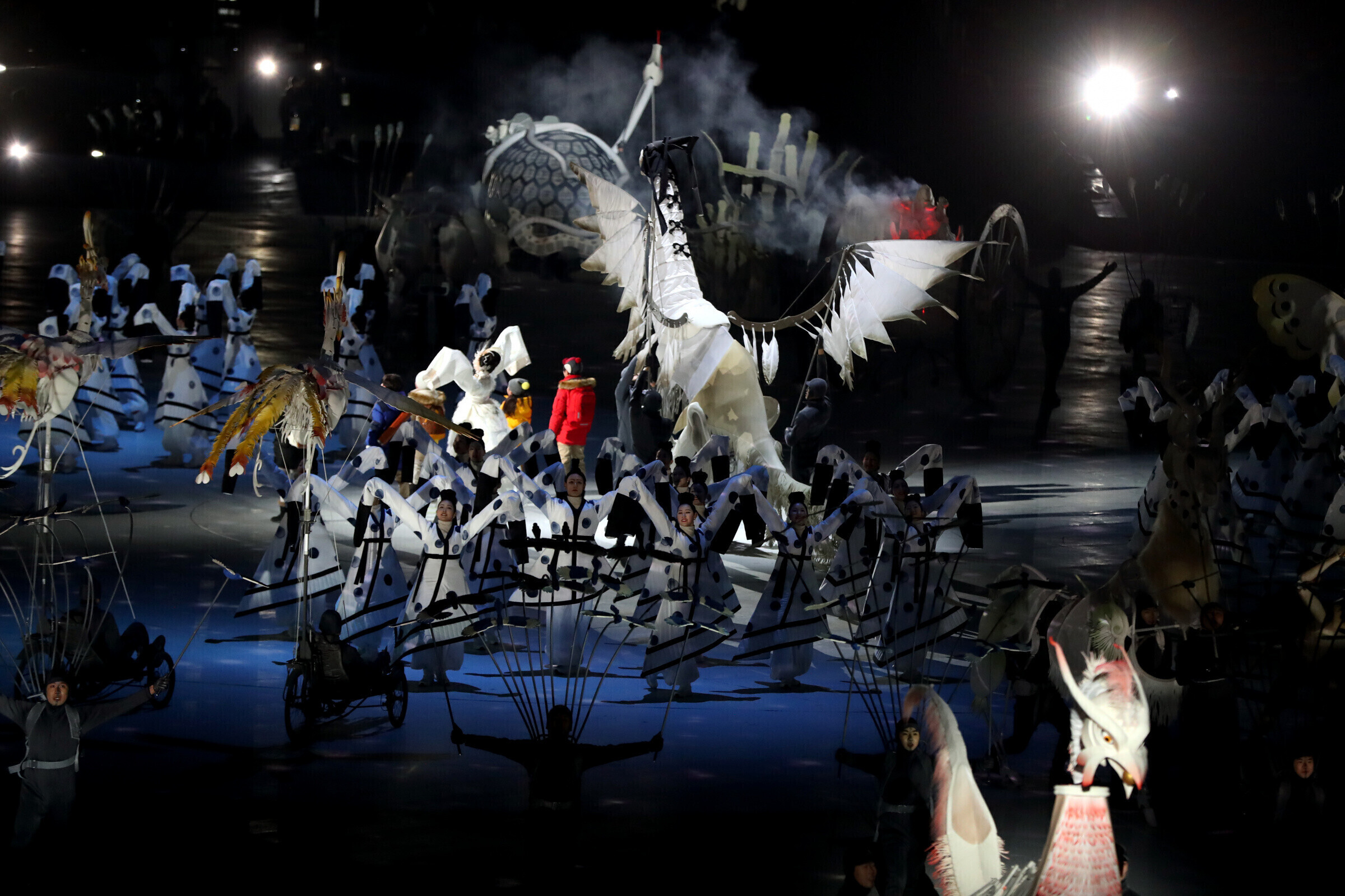 После дефиле олимпийцев продолжился красочный спектакль, знакомящий жителей планеты с колоритом Корейского полуострова. Лейтмотив действа - уникальное смешение технологий и национальных корейских мотивов.