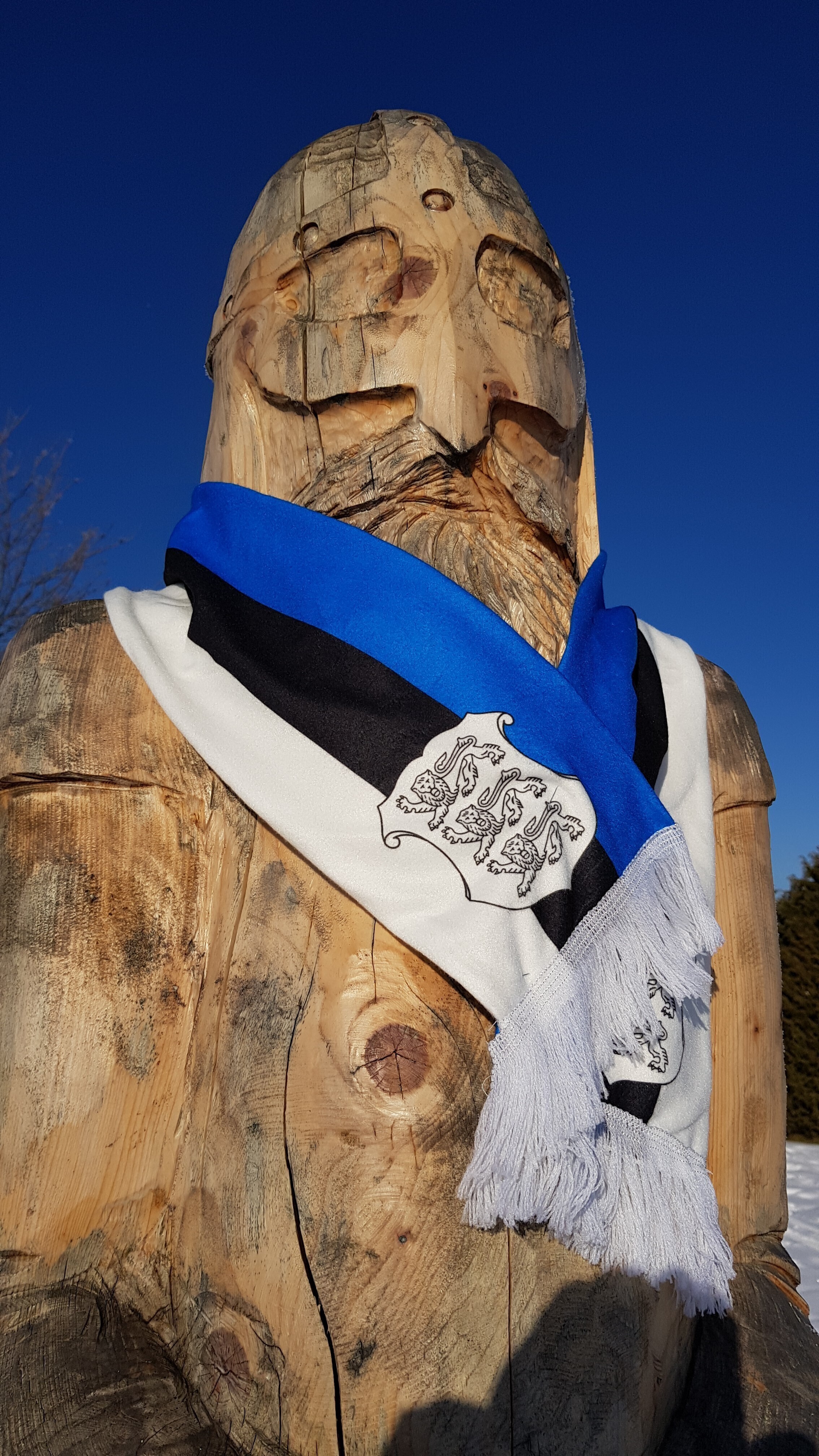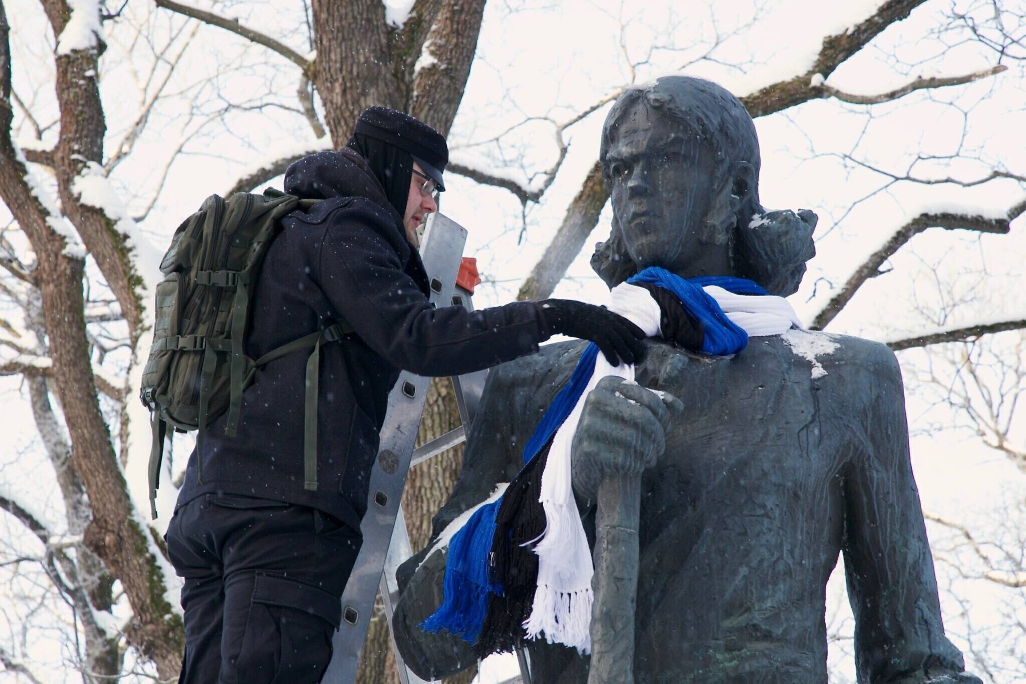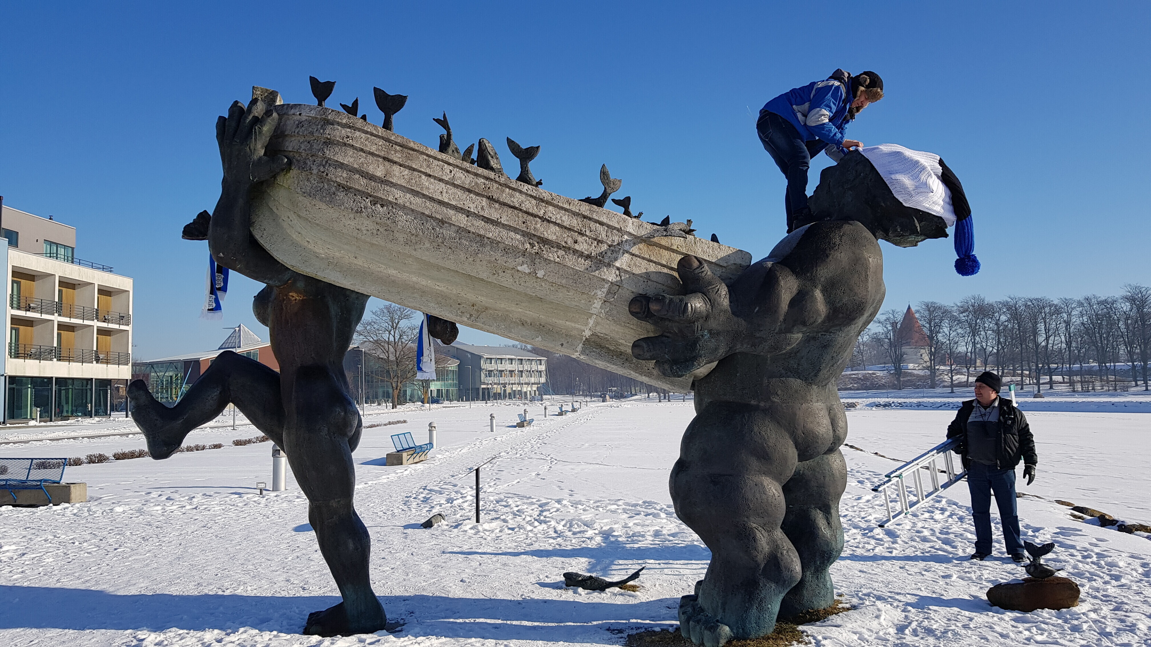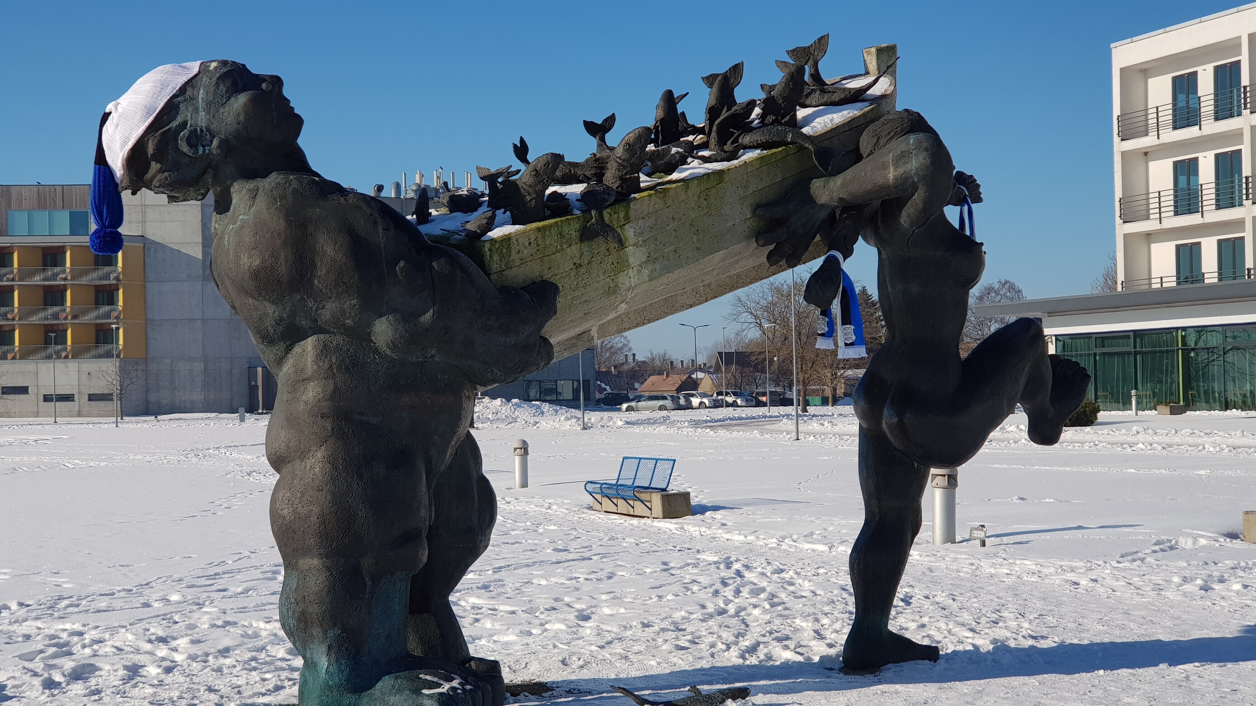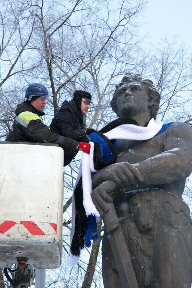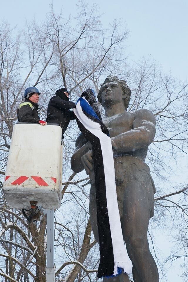 ФОТО: скульптуры по всей Эстонии украсили сине-черно-белыми шарфами и шапками