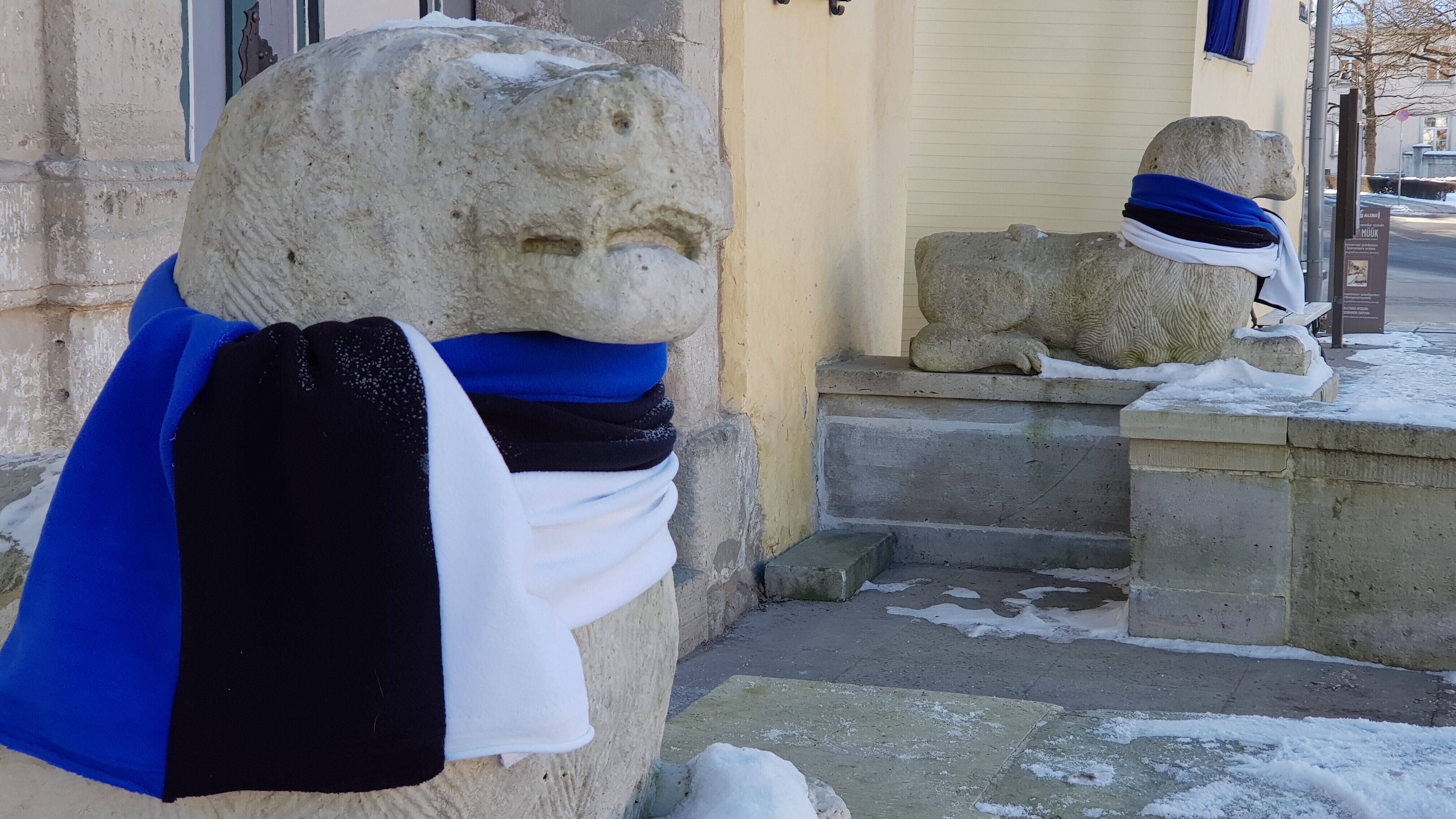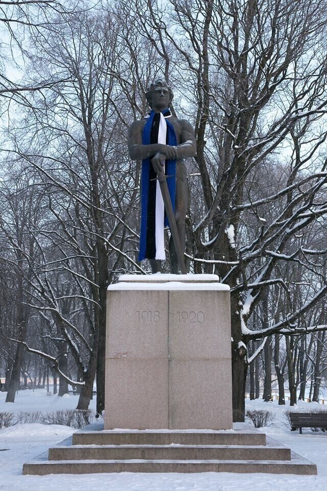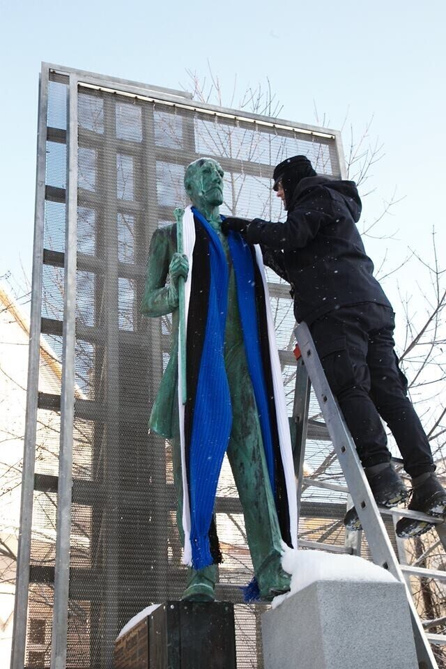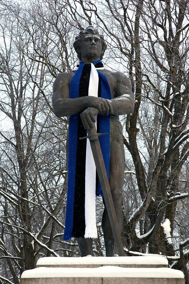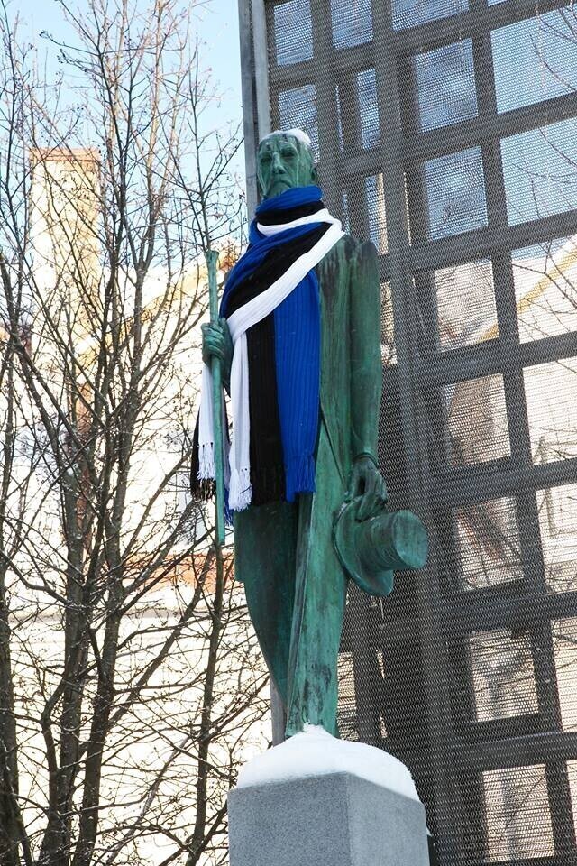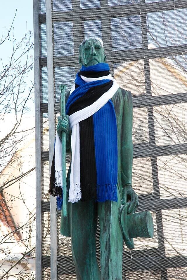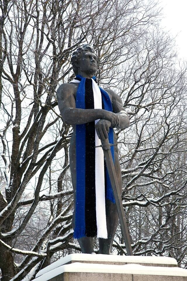 В четверг, 22 февраля, более 20 скульптур по всей Эстонии украсят сине-черно-белыми шарфами в честь 100-летия Эстонской Республики. Смотрите фотографии некоторых из них.