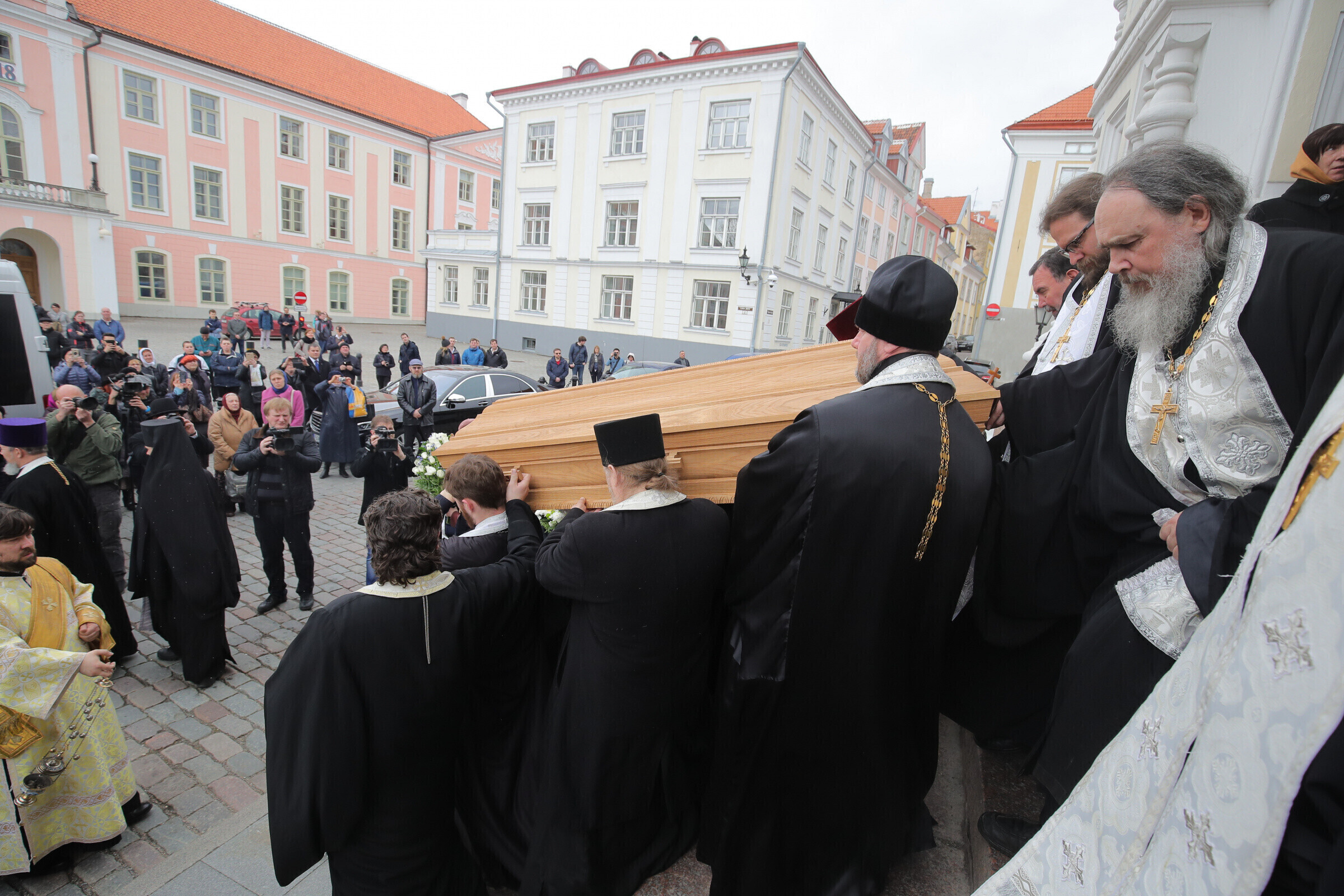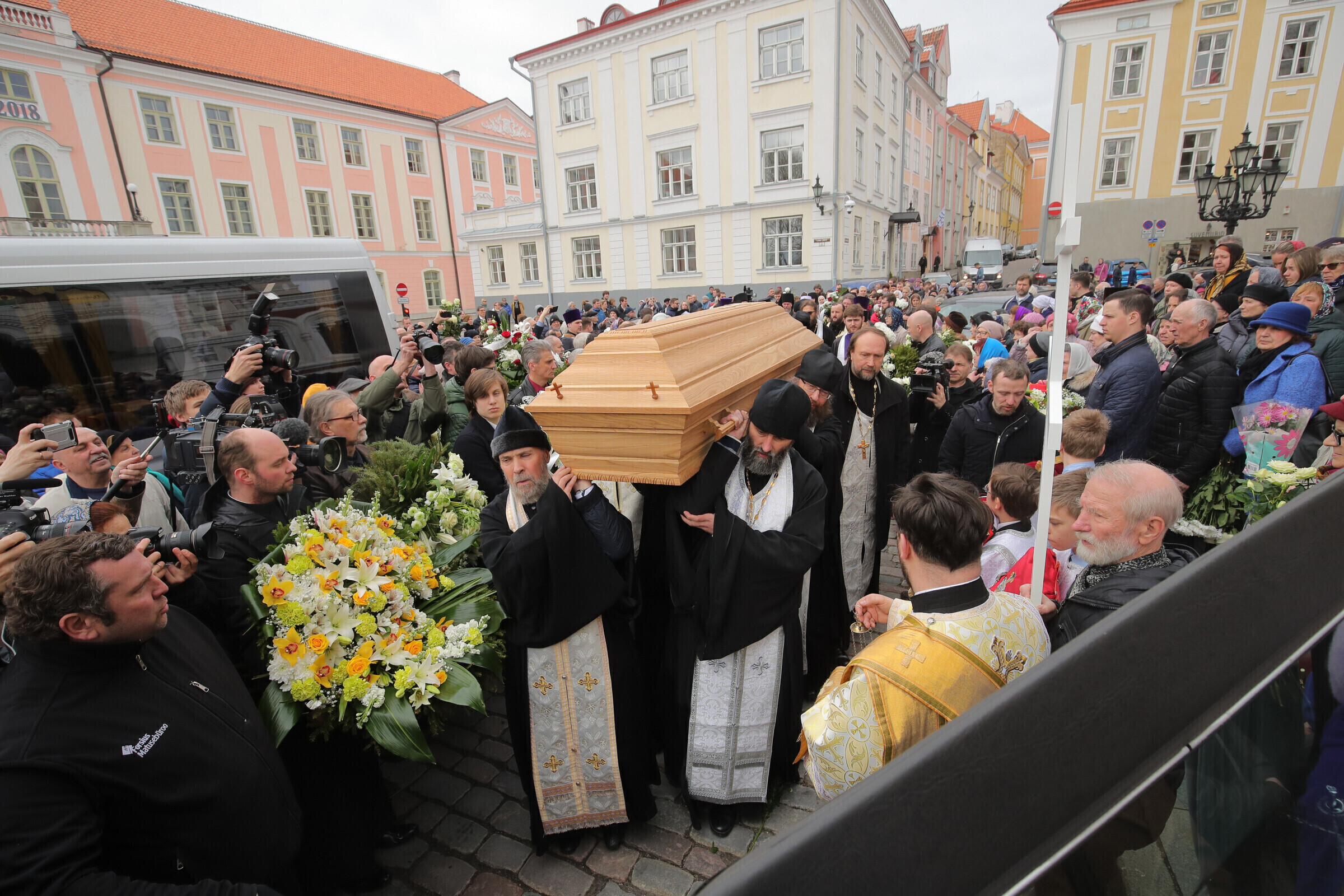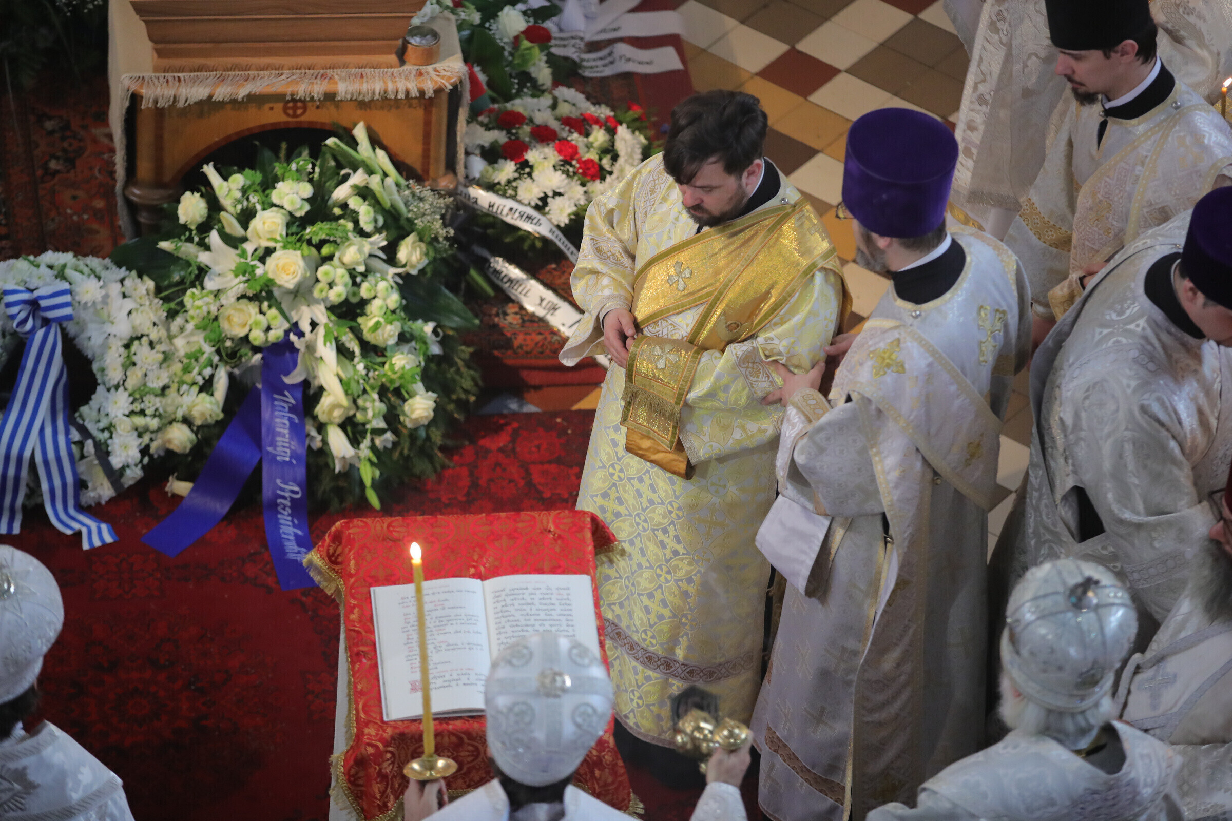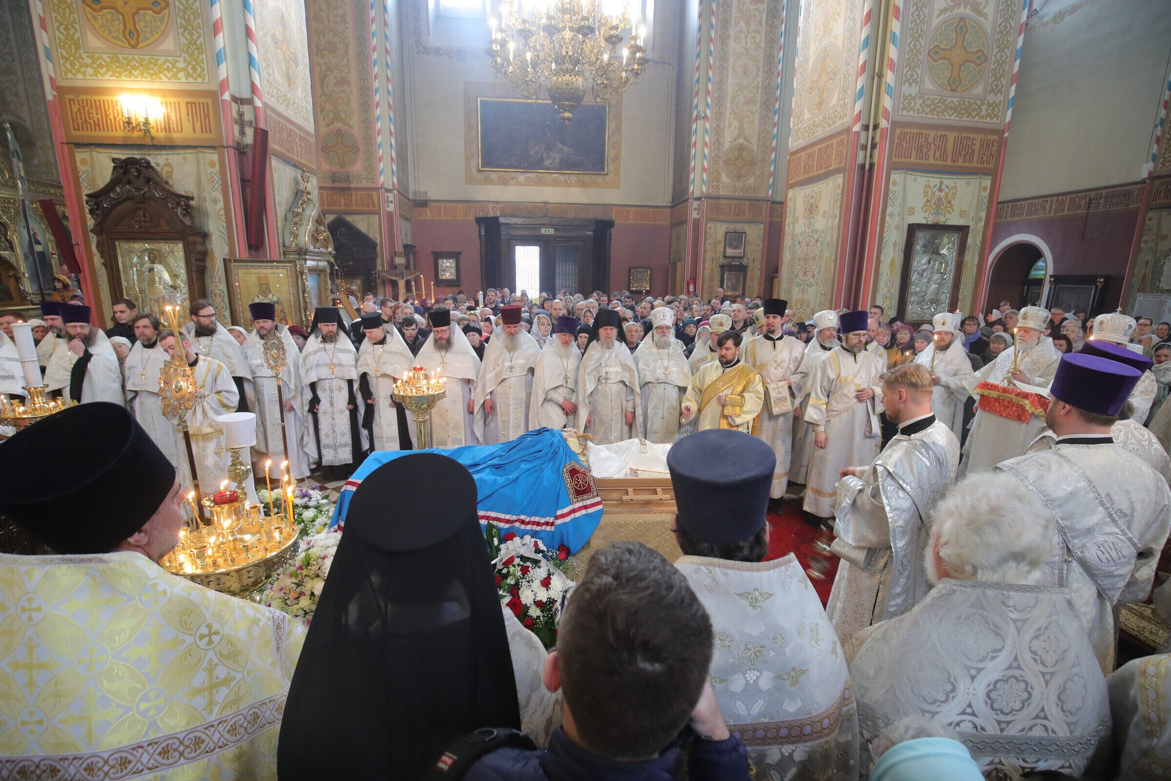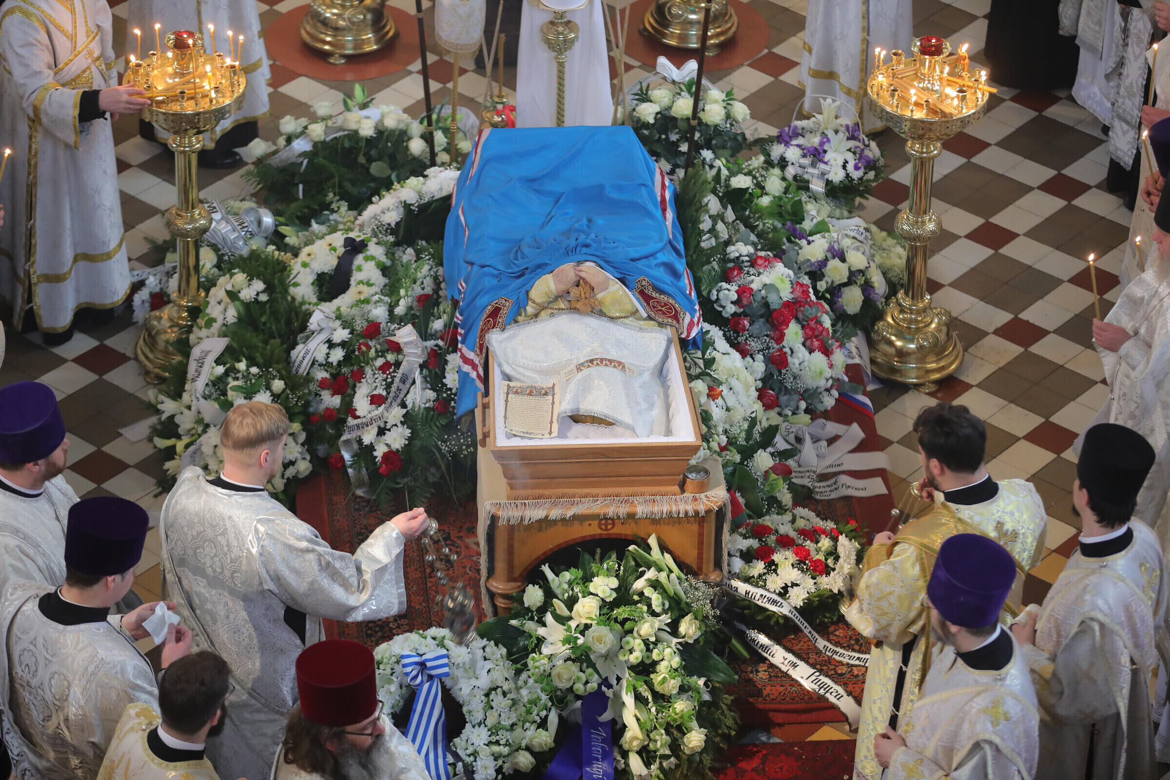 Отпевание возглавил прибывший из Москвы митрополит Волоколамский Иларион - второе лицо Русской православной церкви. Также представлены латвийская и финская православные церкви, прибыло духовенство из Печорского монастыря, присутствует и ректор Московской духовной академии архиепископ Верейский Евгений.