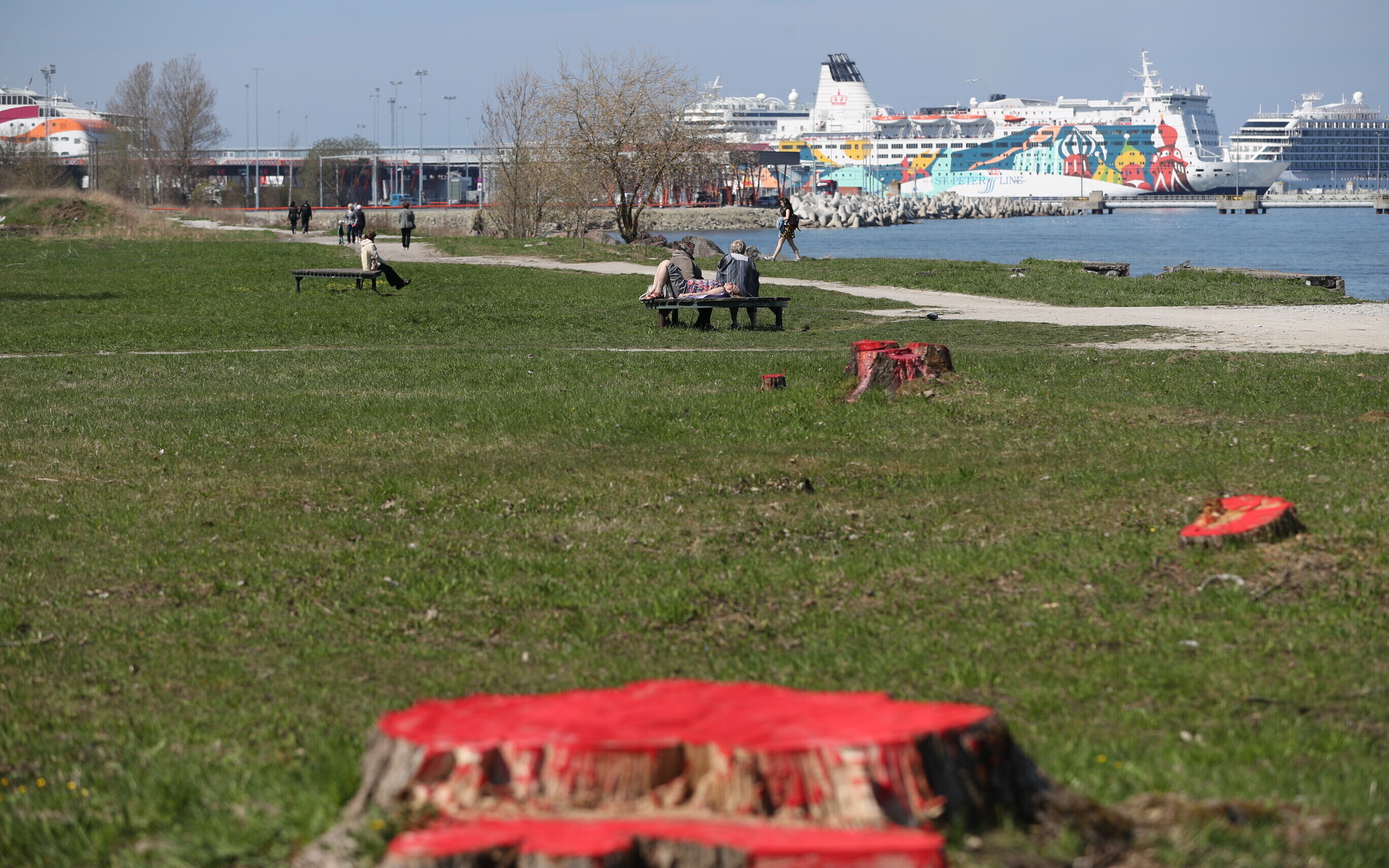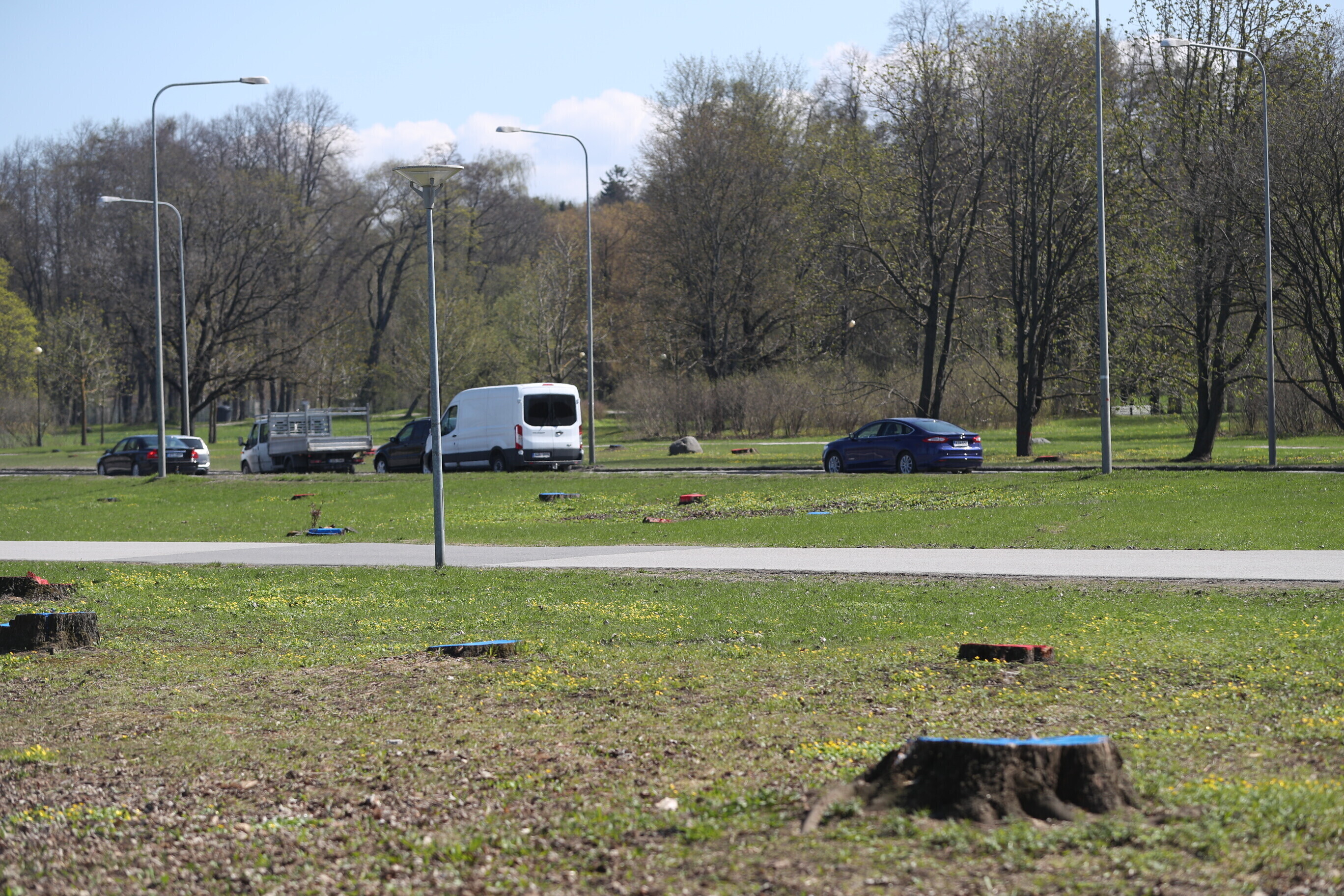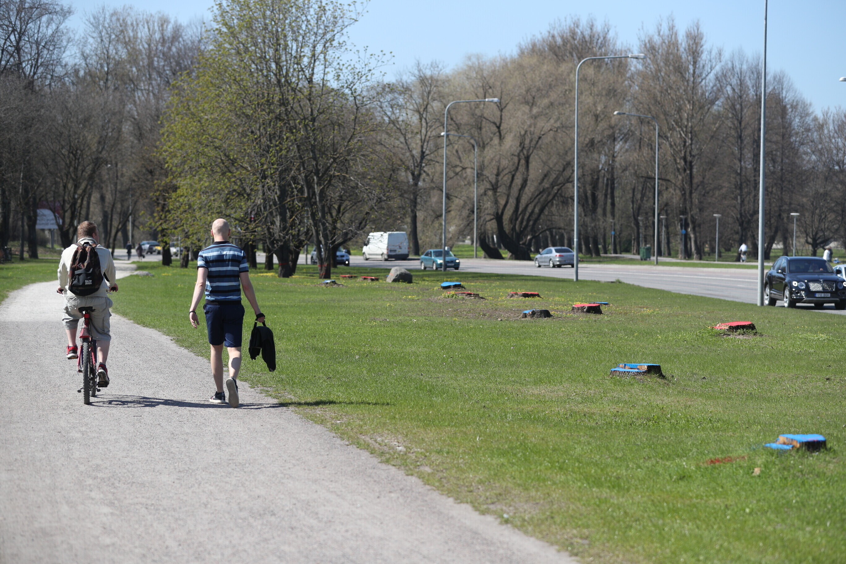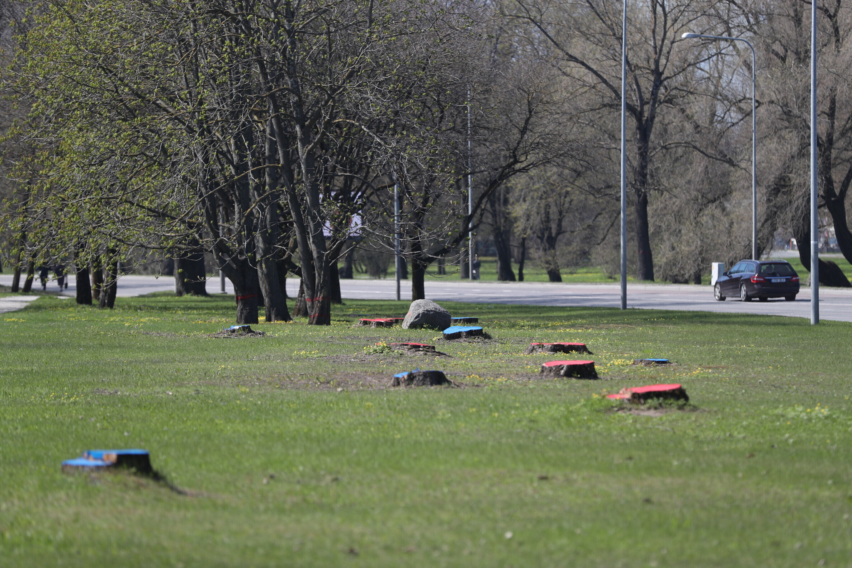 В районе парка Кадриорг в Таллинне, там где будет проходить будущая Рейди теэ, неизвестные окрасили пни спиленных деревьев в красный и синий цвета.