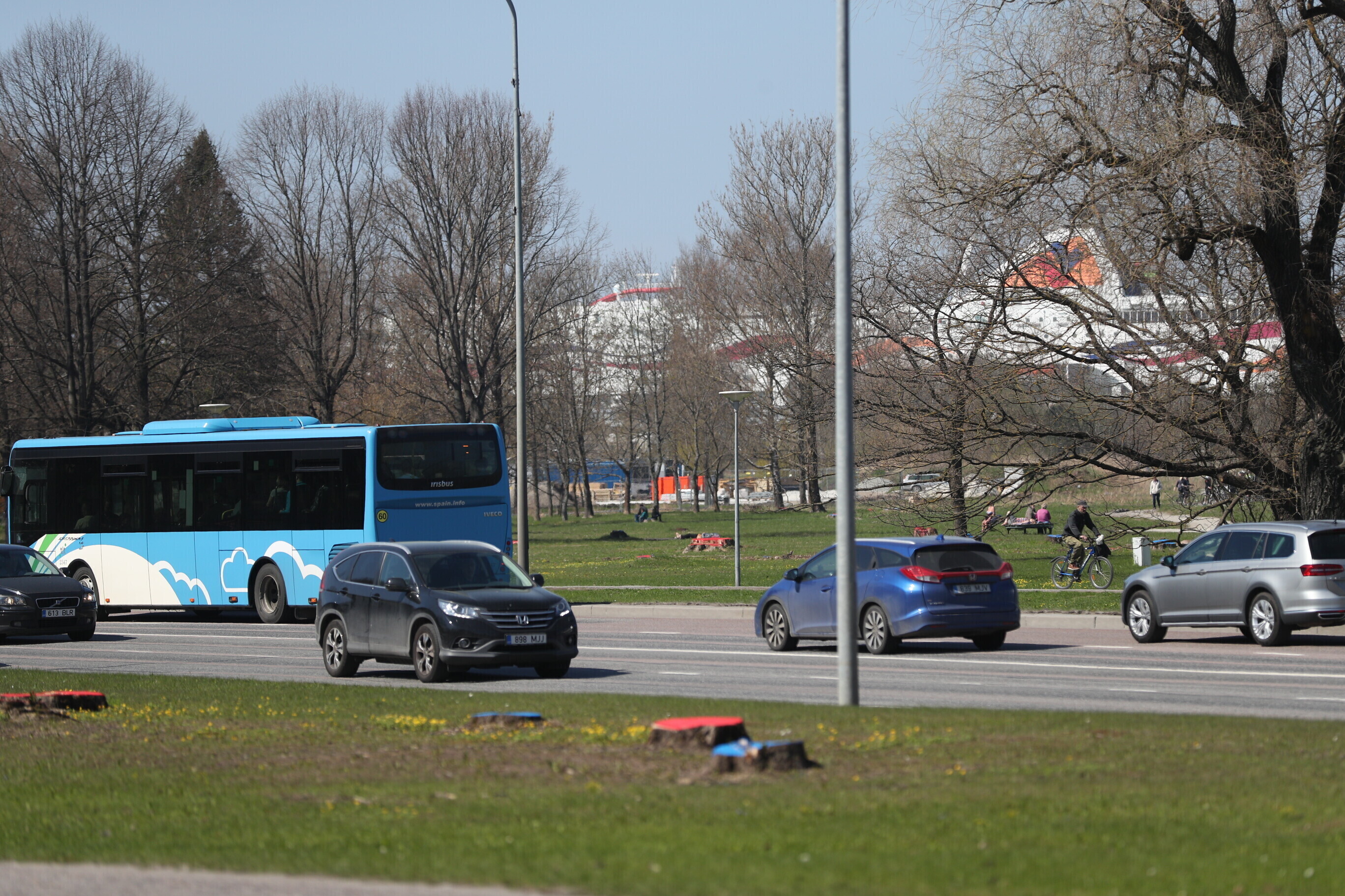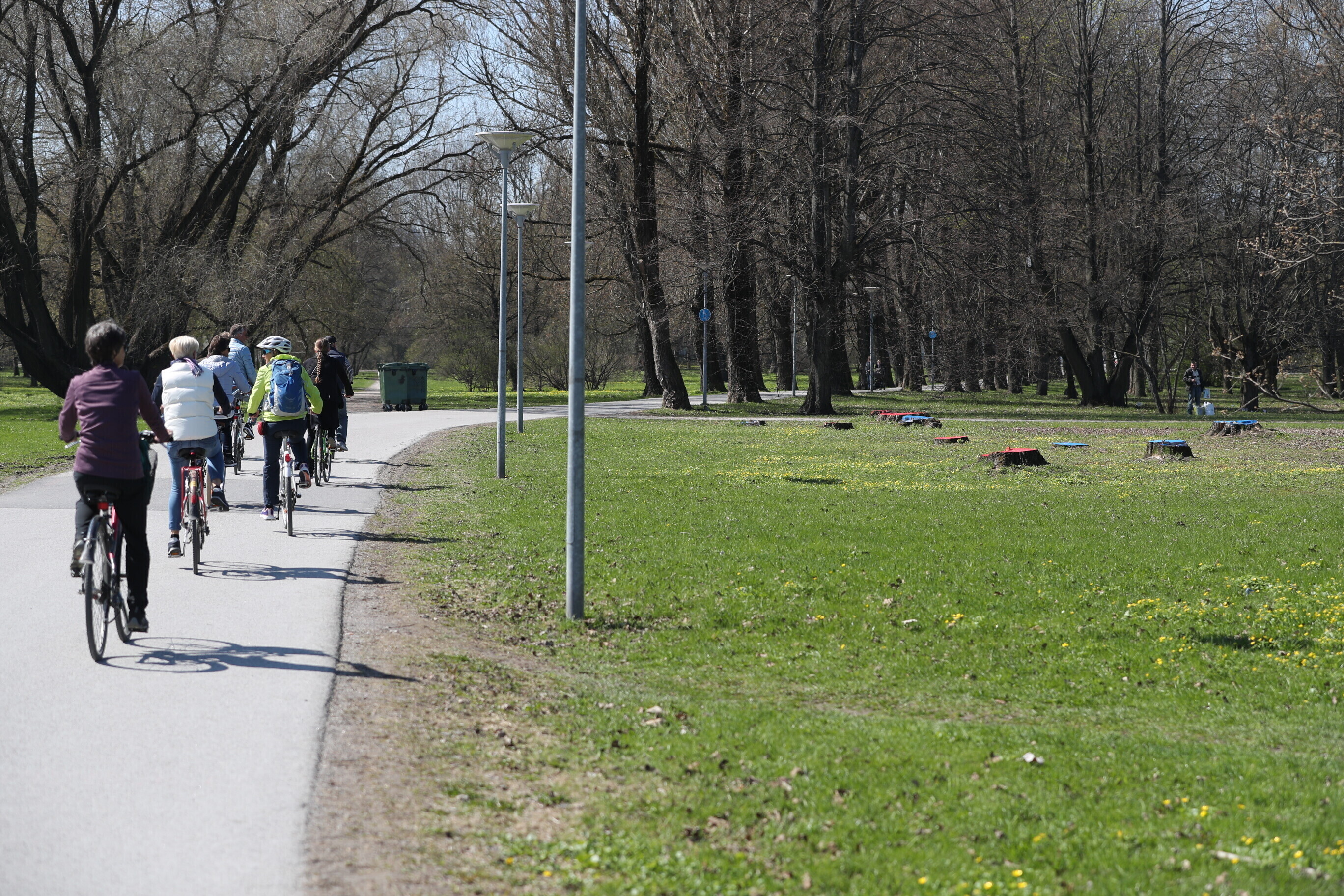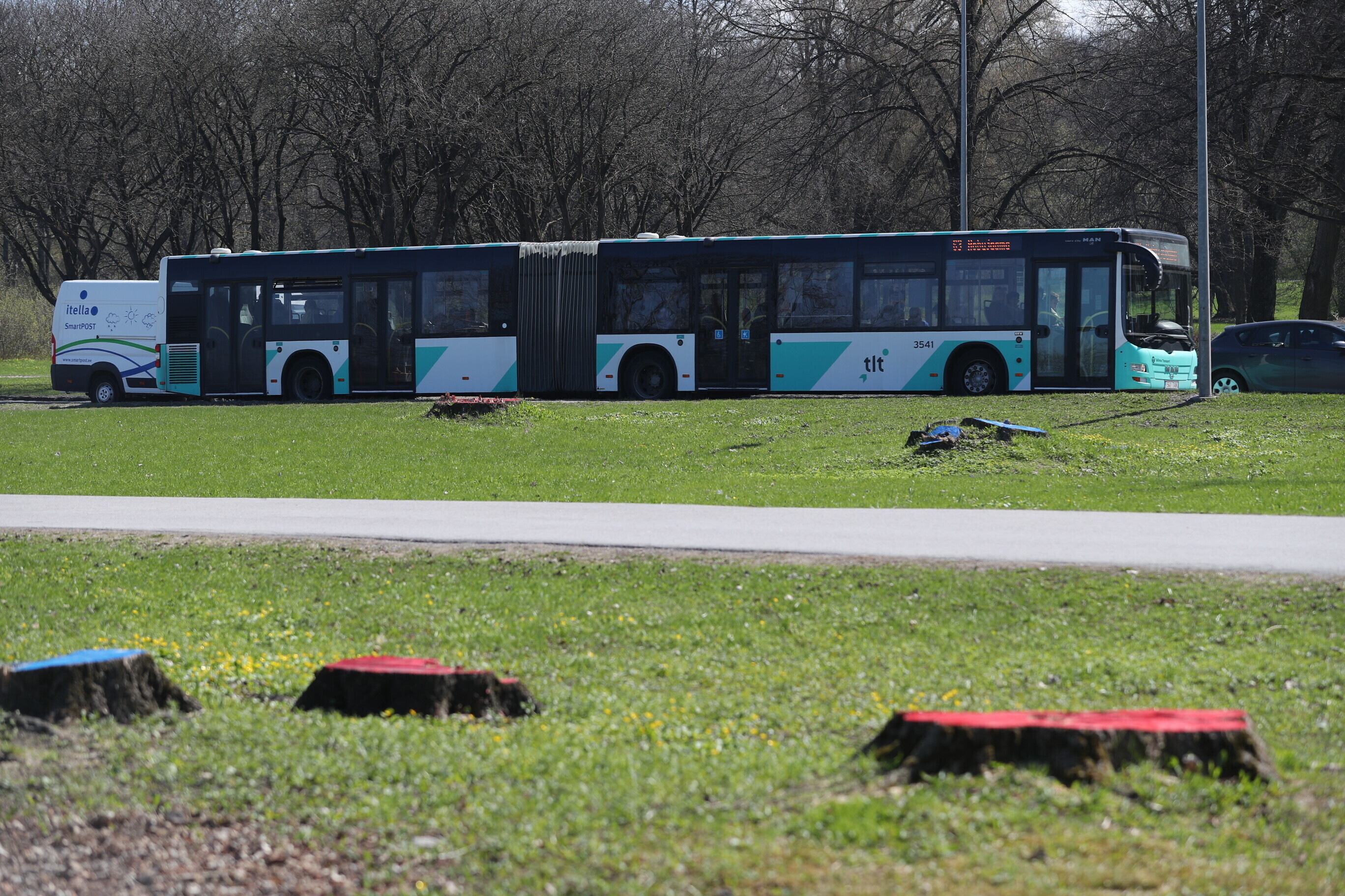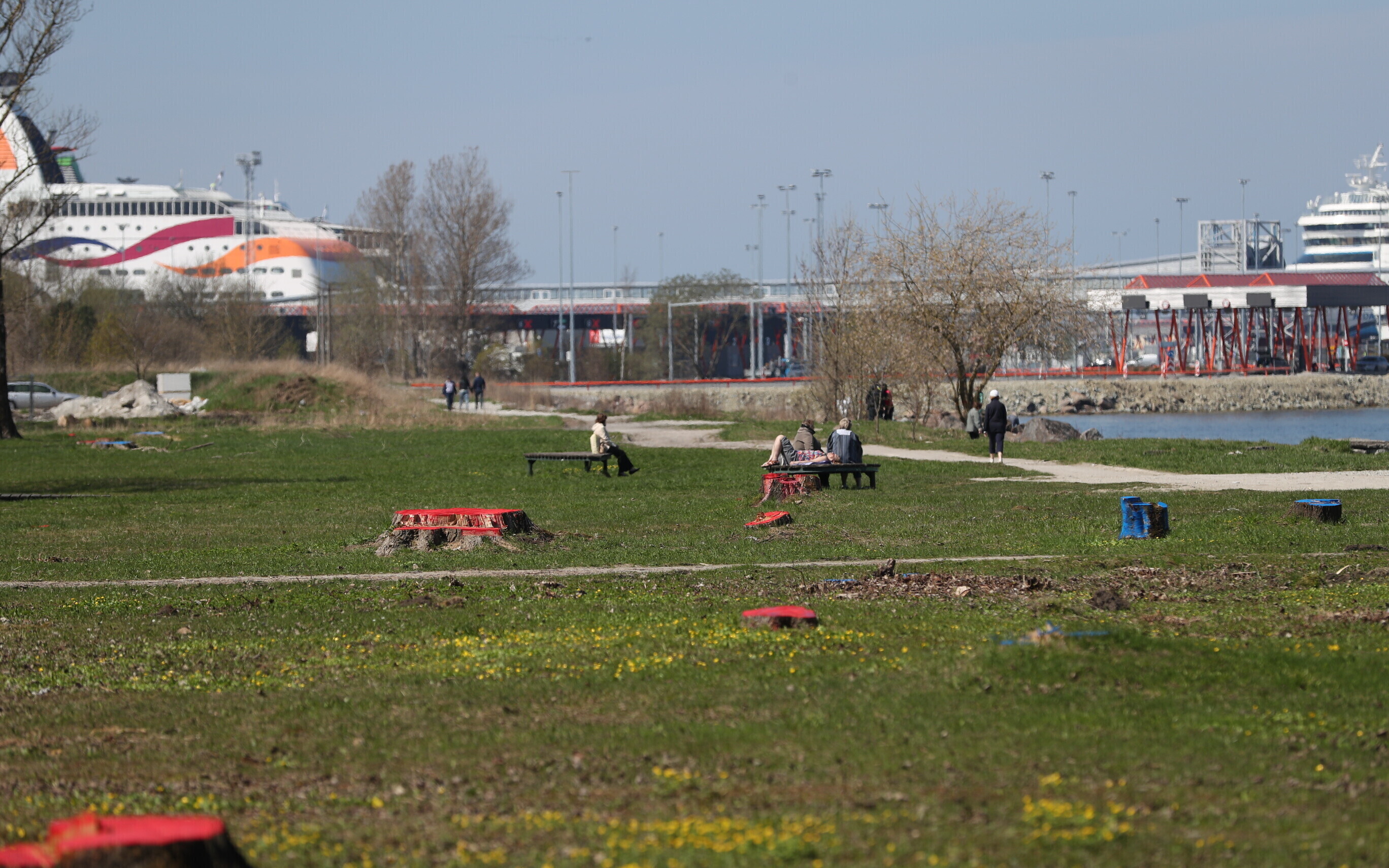 В районе парка Кадриорг в Таллинне, там где будет проходить будущая Рейди теэ, неизвестные окрасили пни спиленных деревьев в красный и синий цвета.