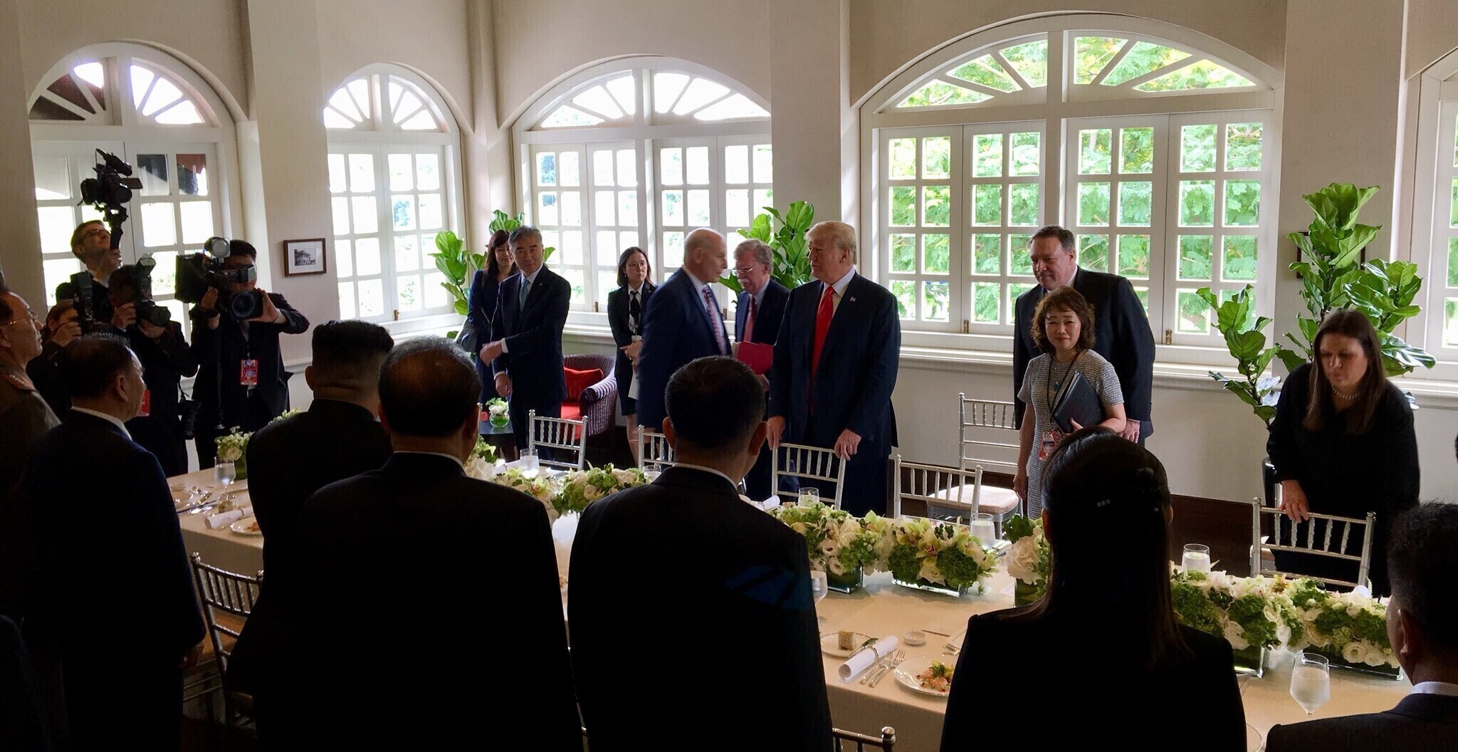 Около 50 минут лидеры США и КНДР беседовали один на один (с переводчиками), после чего к ним присоединились советники и высокопоставленные участники обеих делегаций - со стороны США госсекретарь Майк Помпео, советник по национальной безопасности Джон Болтон, глава аппарата Белого дома Джон Келли, а со стороны КНДР - замглавы Трудовой партии Кореи (ТПК) Ким Ён Чхоль, министр иностранных дел КНДР Ли Ён Хо и заместитель председателя ЦК ТПК Ли Су Ён.