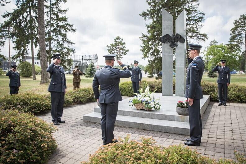 На торжественном построении ВВС на авиабазе Эмари отметили отличившихся военных, также вместе с ветеранами ВВС возложили венок к памятнику "Последний полет".