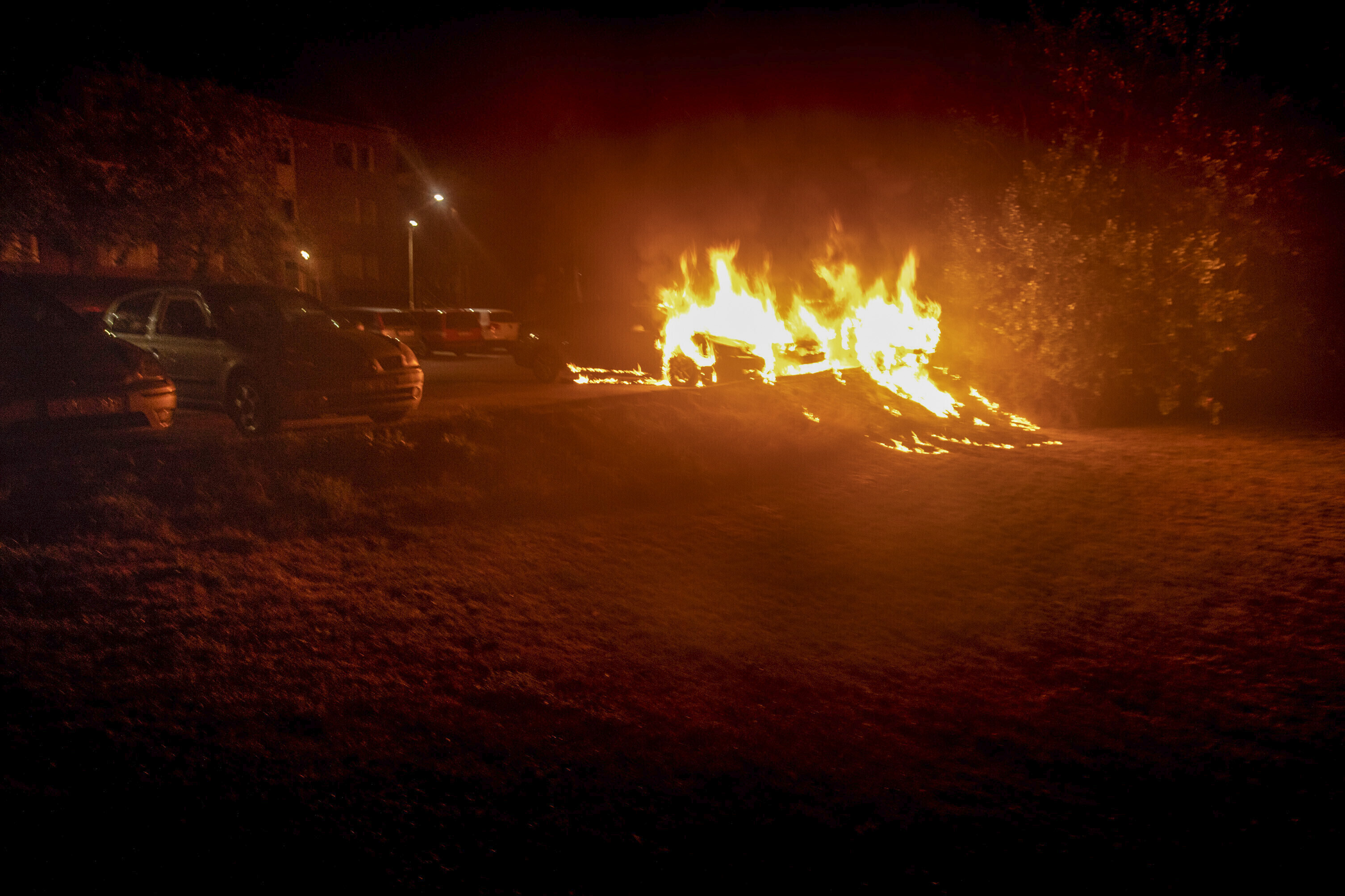 Десятки автомобилей оказались объяты пламенем в ночь на вторник, 14 августа, на юго-западе Швеции.