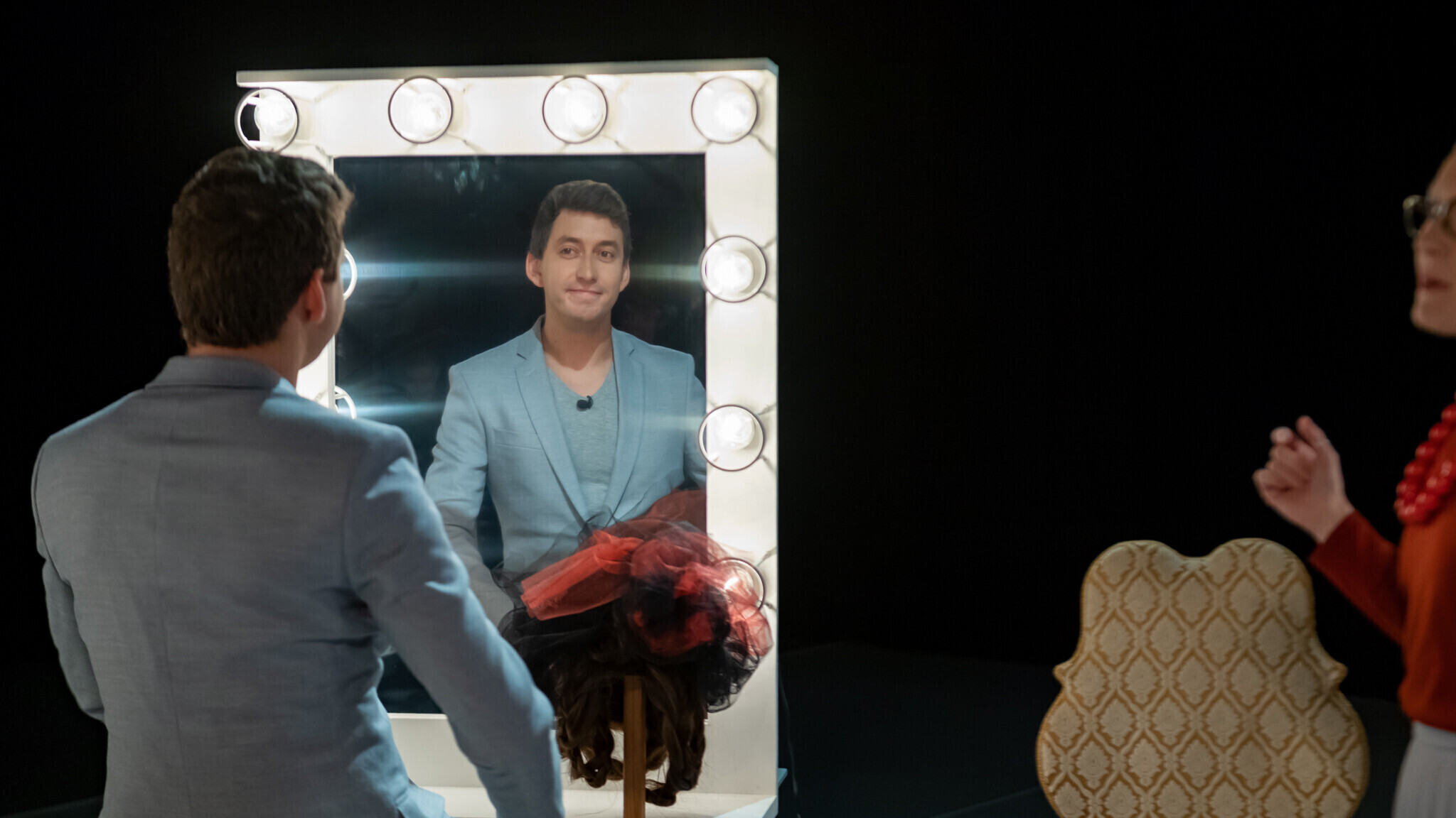 Ведущих актеров театра встречают их коллега Татьяна Космынина и художественный руководитель Филипп Лось. Разговор с Татьяной ведется в театральной гримерке, откуда она вместе со своими гостями наблюдает, как каждый по очереди выходит "на ковер" к художественному руководителю.