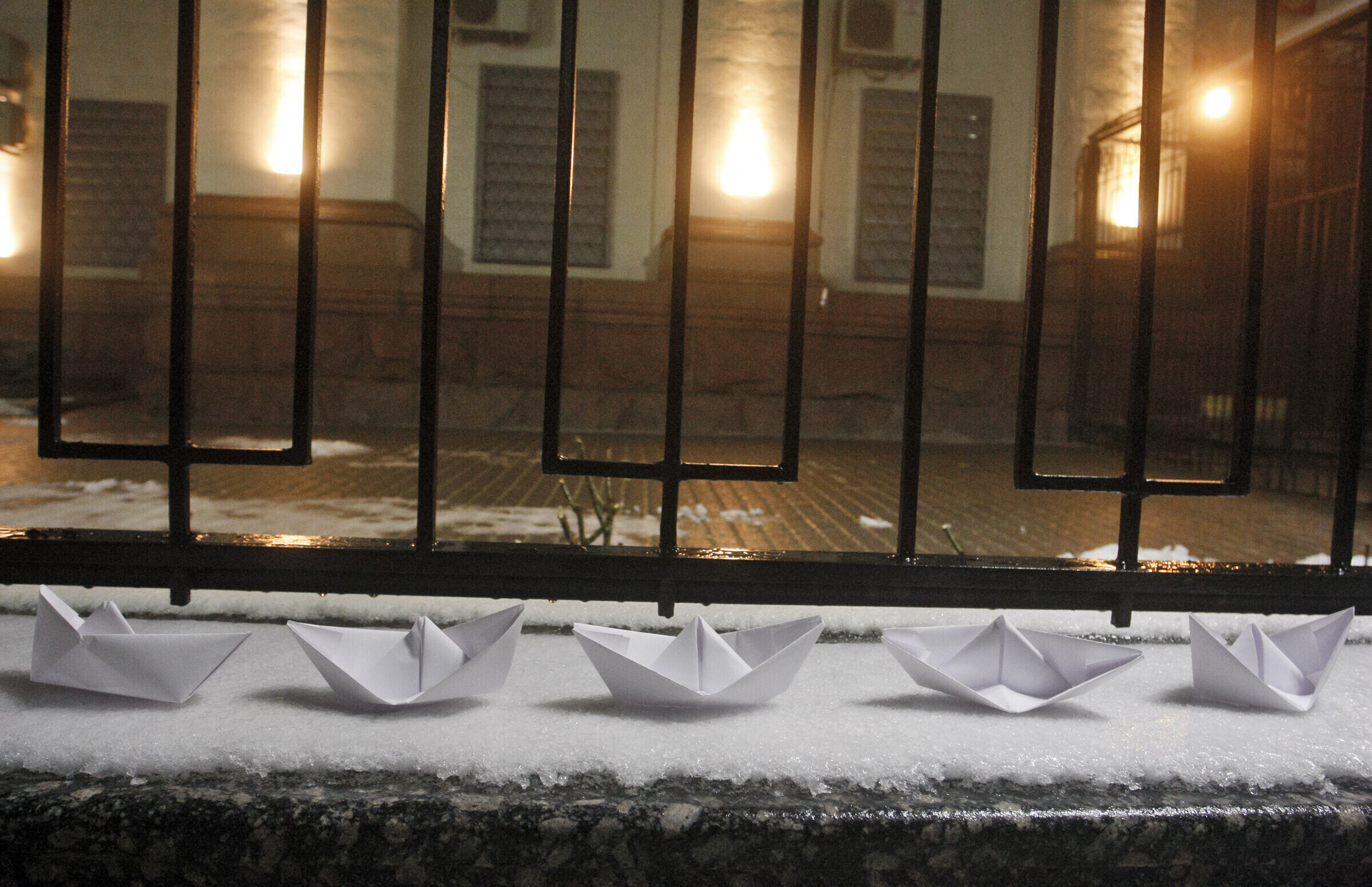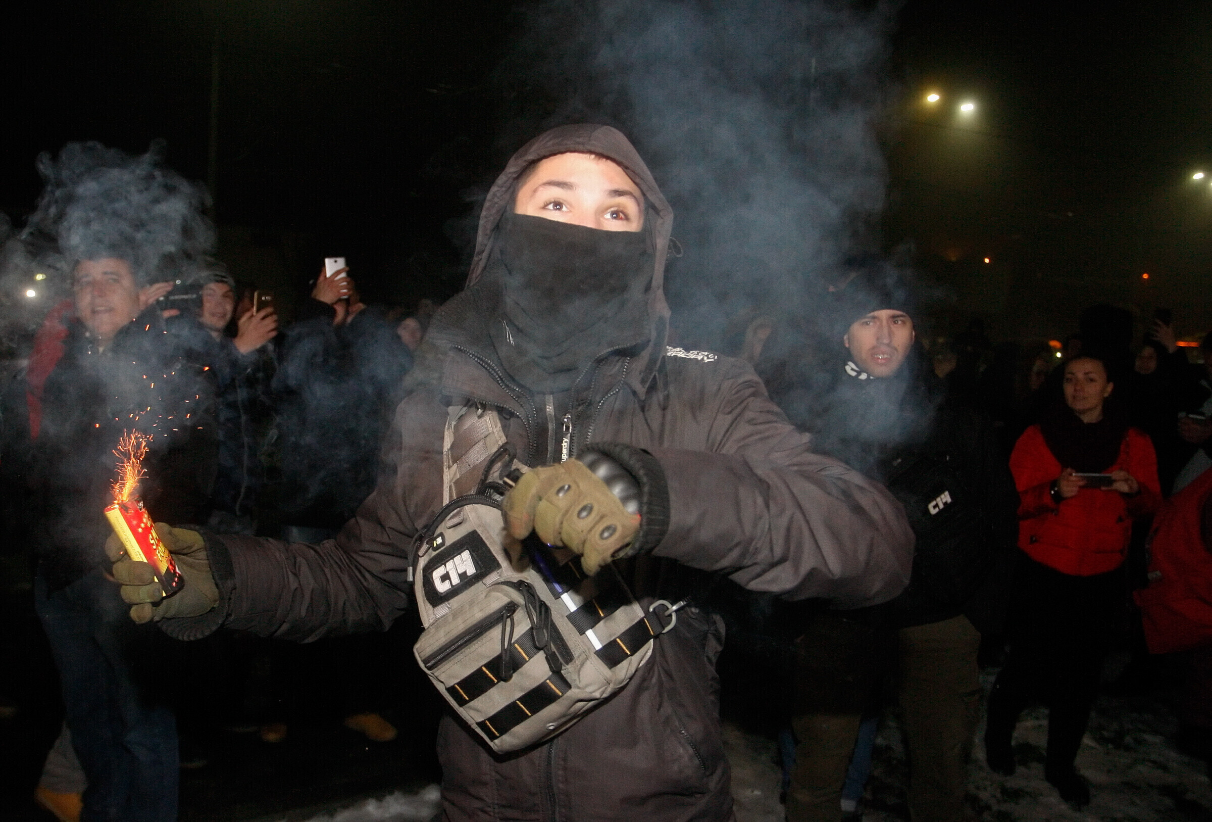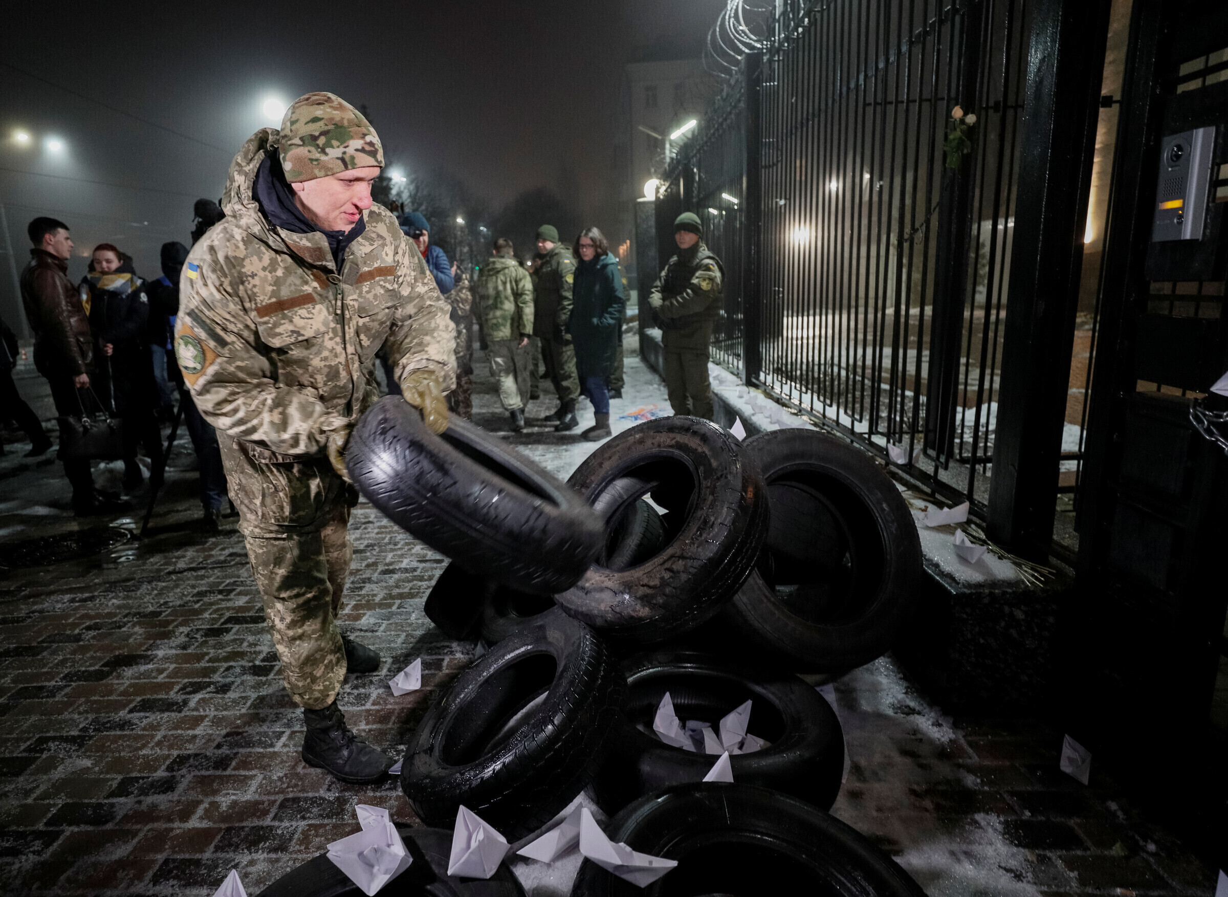 У здания российского посольства в Киеве в ночь на понедельник, 26 ноября, прошел стихийный митинг против действий РФ во вспыхнувшем накануне конфликте в Керченском проливе. Собралось несколько десятков человек, некоторые из них бросали дымовые шашки на территорию посольства.