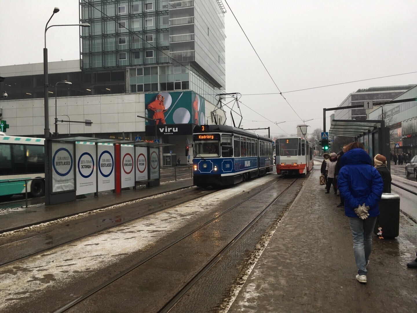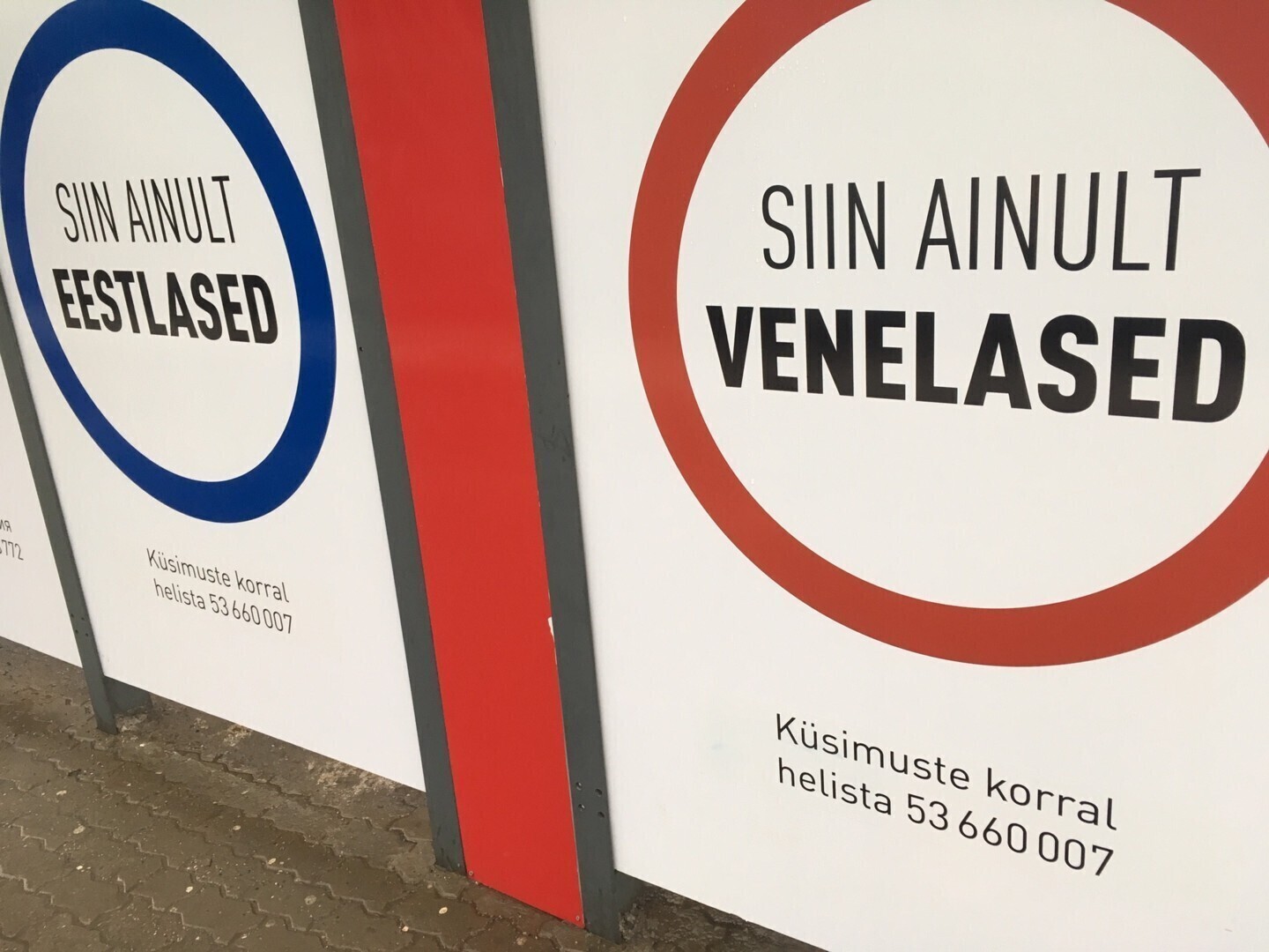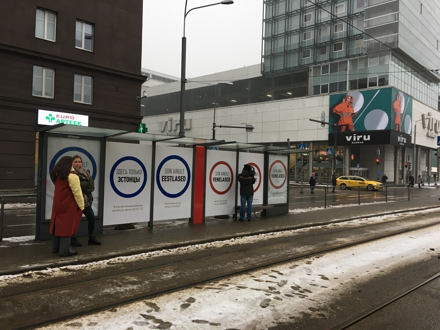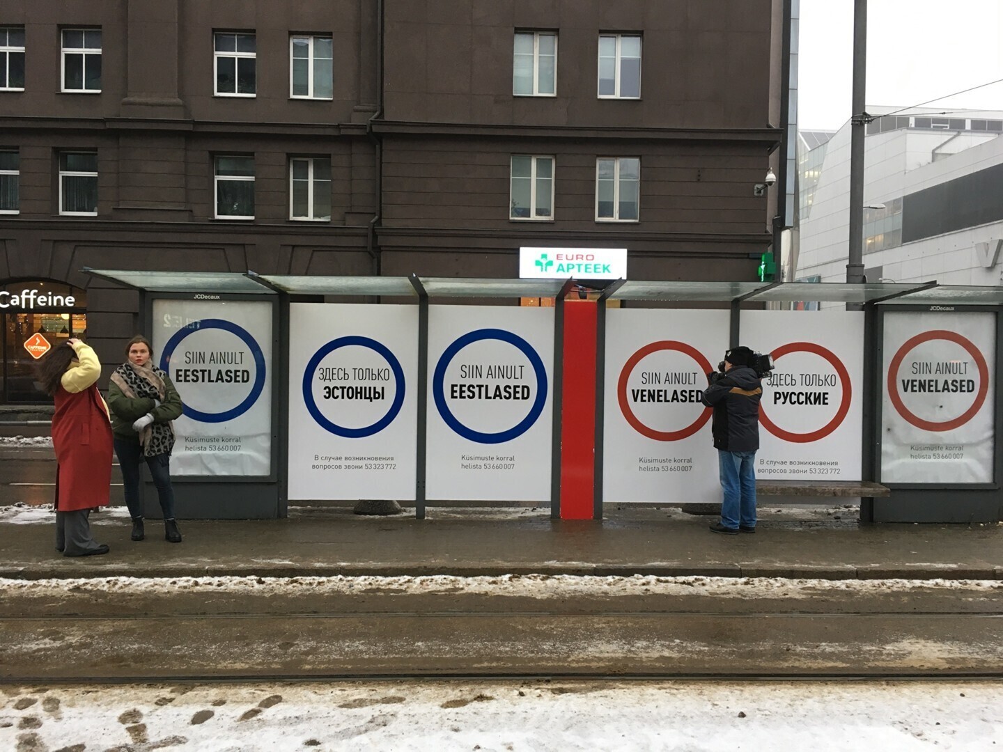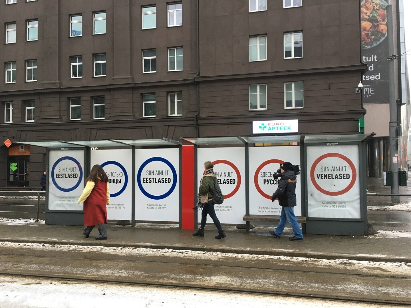 Размещенные на остановке плакаты с одинаковыми надписями на русском и эстонском языках "Здесь только русские" и "Здесь только эстонцы" словно бы делят павильон на две части. Другого текста на плакатах нет, кроме сообщения о возможности позвонить по телефону в случае вопросов, при этом указанные на плакатах номера телефонов отличаются друг от друга.