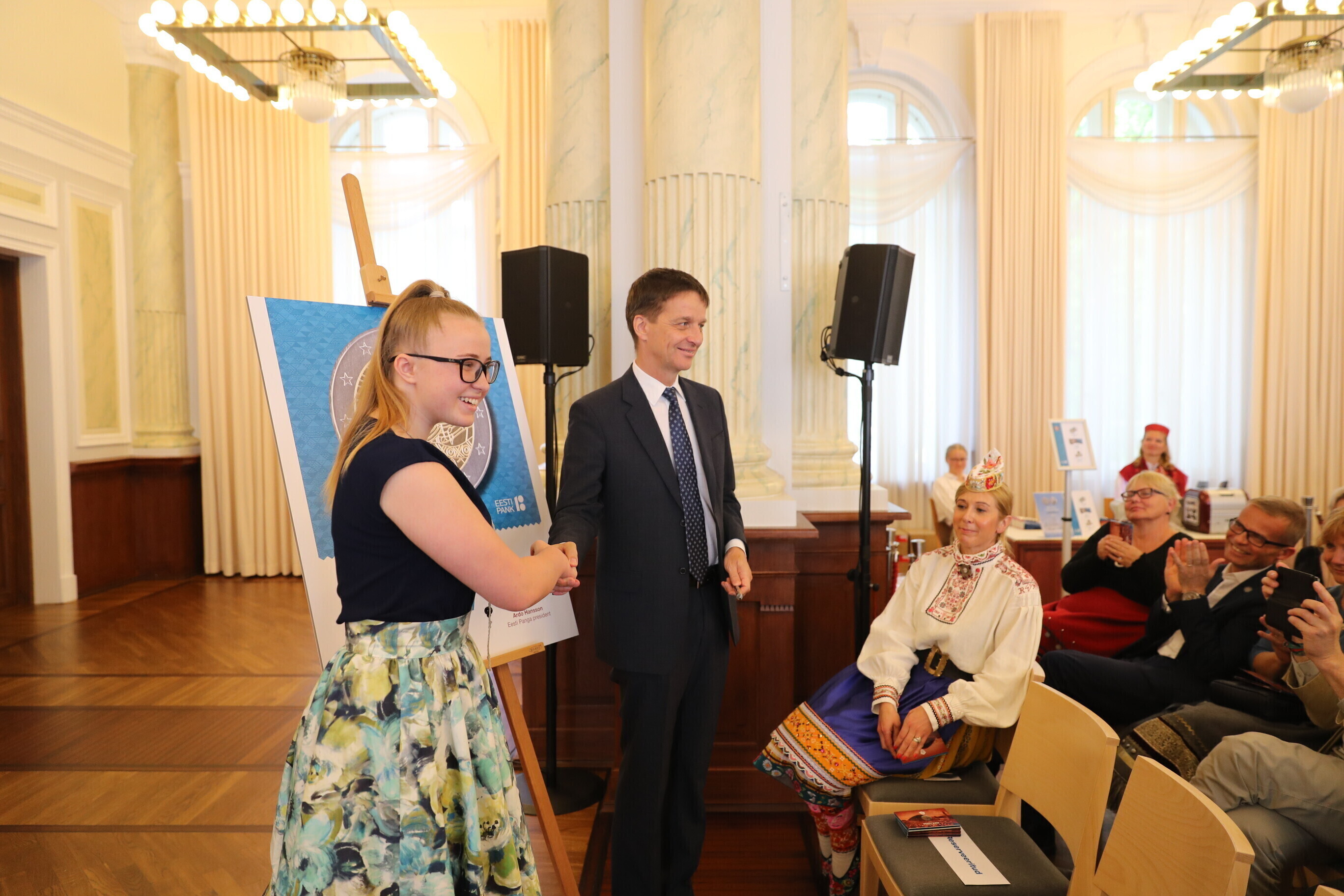 В среду, 29 мая, Банк Эстонии (Eesti Pank) представил монету в 2 евро, посвященную проходящему в этом году празднику песни и танца, которому исполняется 150 лет. Присутствующие на презентации могли купить монету вместе с картой.