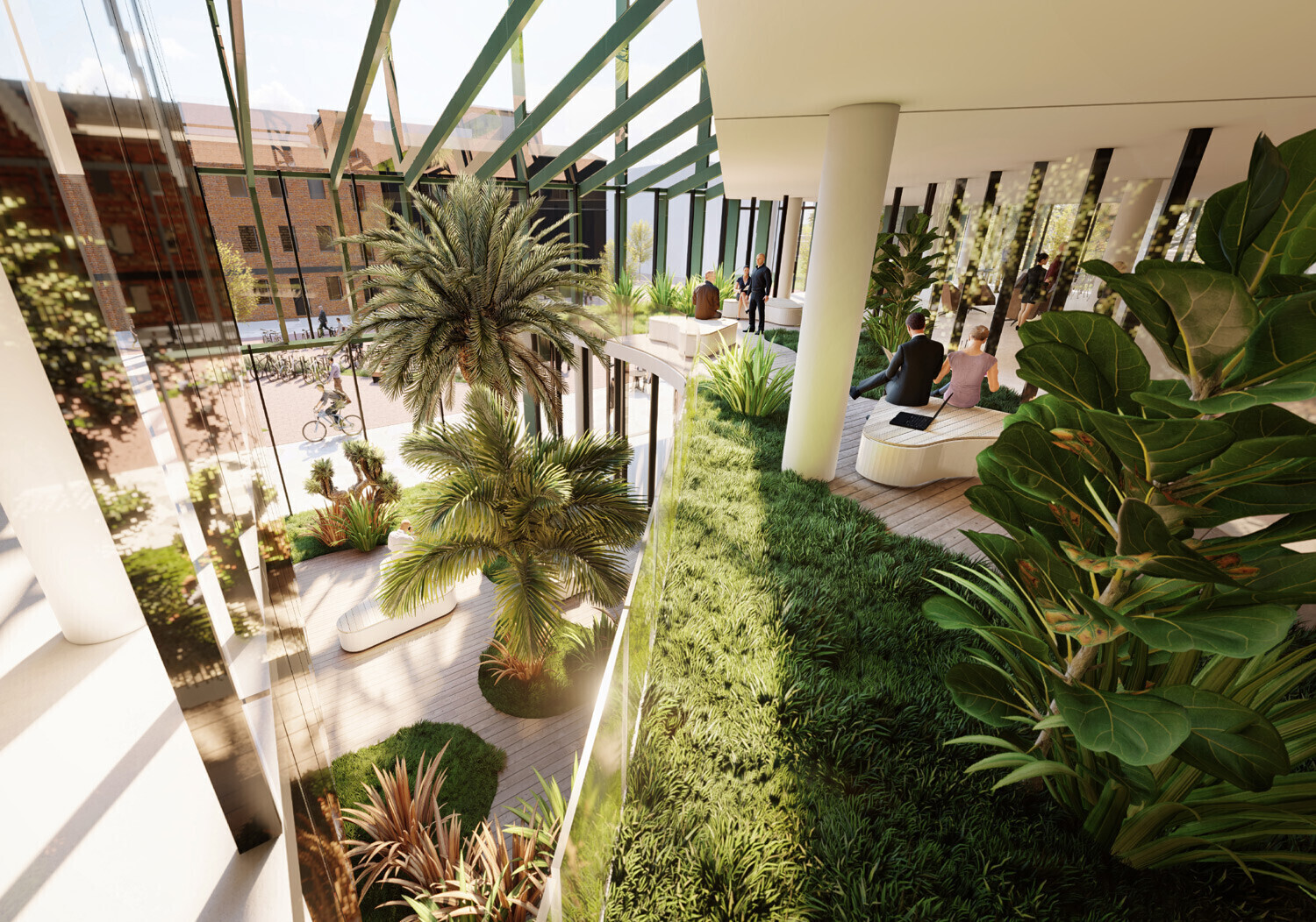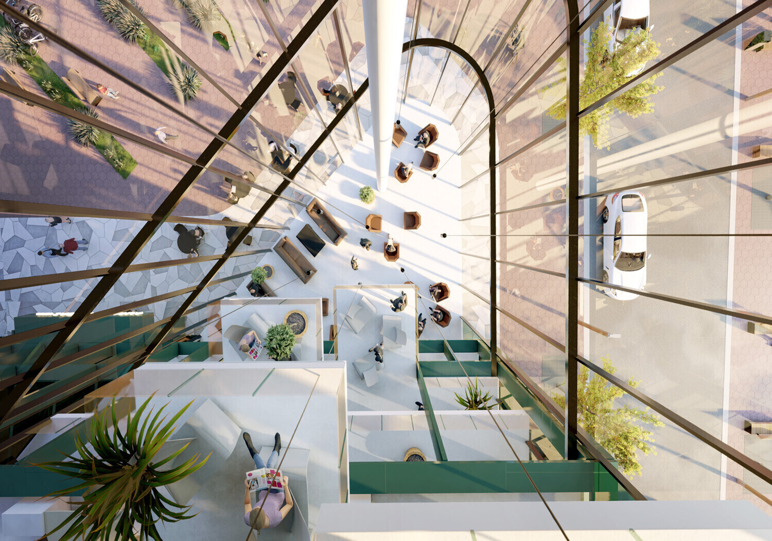 В исходном задании архитекторам было поручено создать просторный и привлекательный главный вход, а в офисных помещениях обеспечить атмосферу, способствующую творческой работе, сочетая рабочие места с местами для отдыха и социализации.