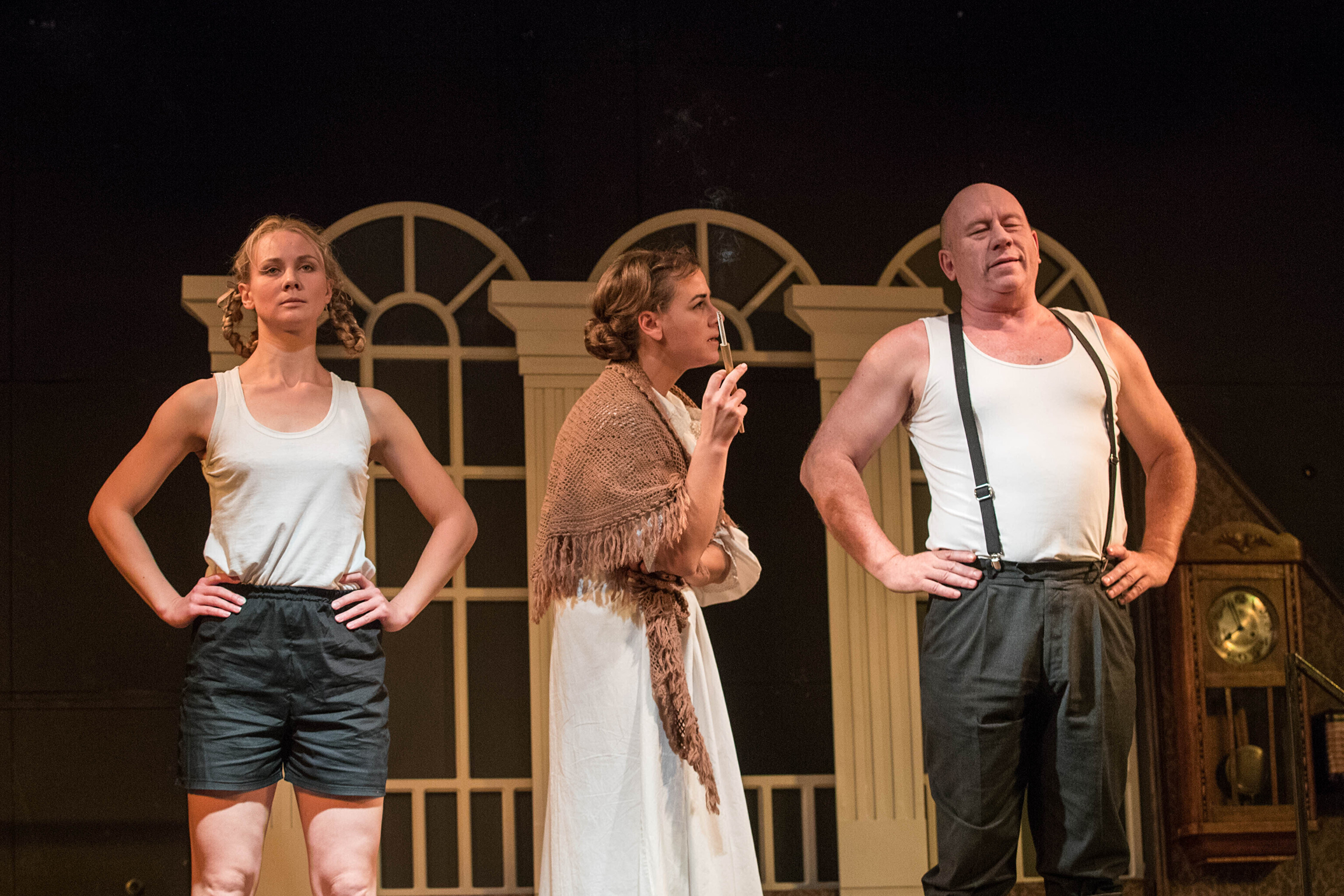 Роли трех сестер исполняют Лидия Головатая, Лилия Шинкарева и Елена Яковлева. Также в спектакле заняты Иван Алексеев, Татьяна Егорушкина, Юлия Зозуля, Дмитрий Косяков, Анна Маркова, Александр Окунев, Михаил Пащук (Студия Русского театра) и Денис Волков (Студия Русского театра).