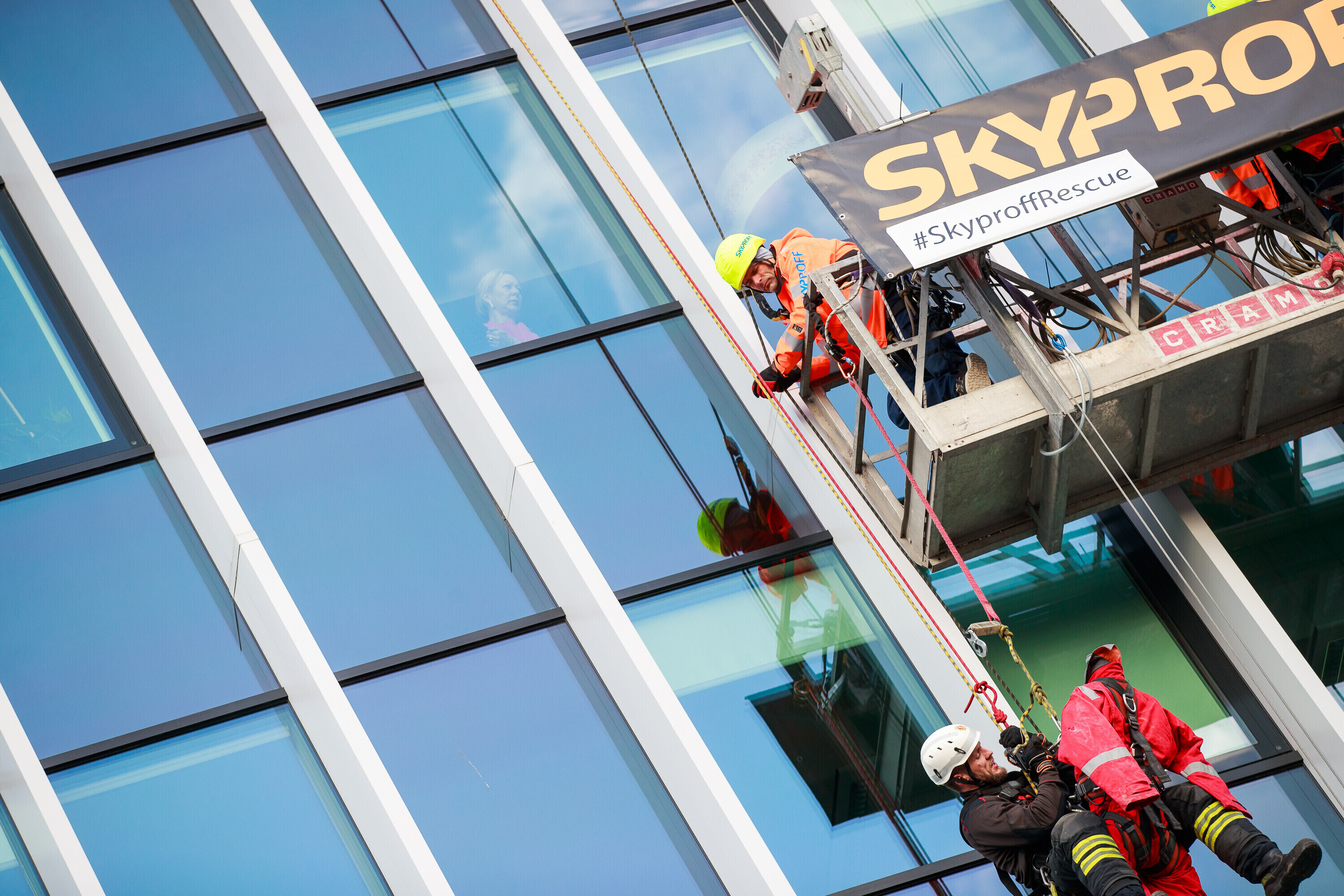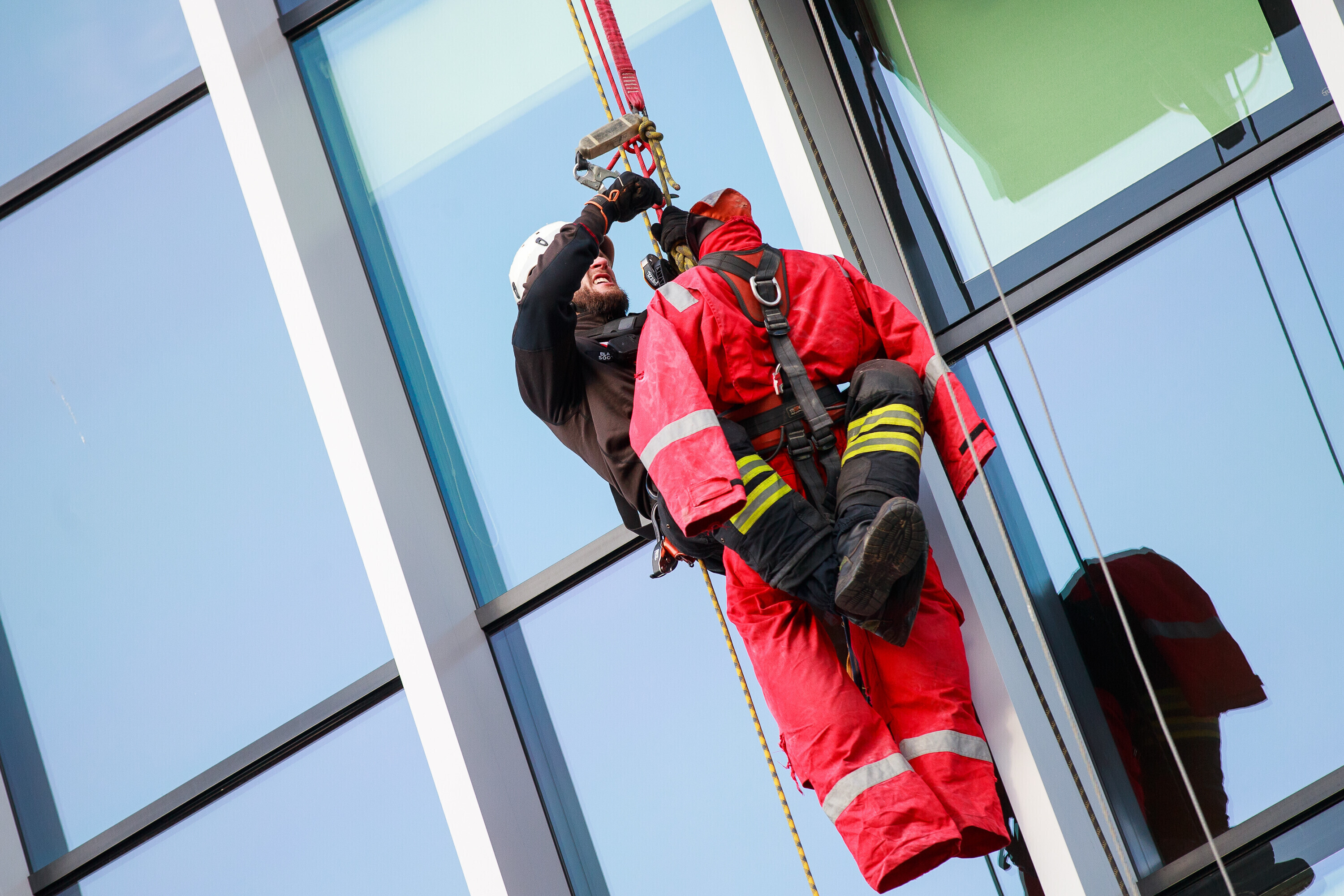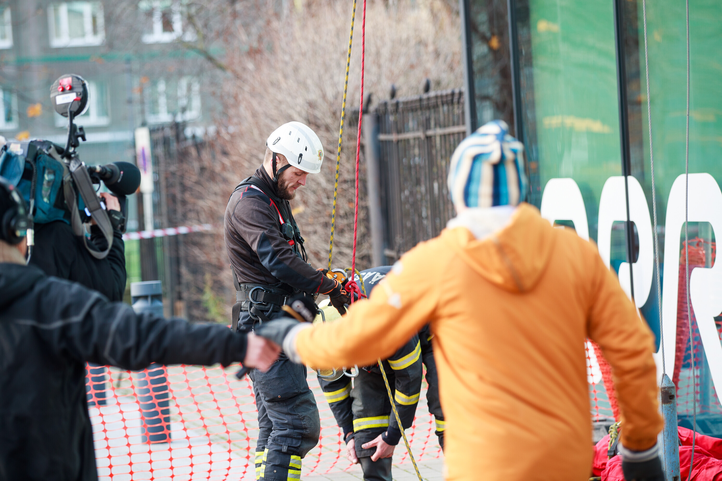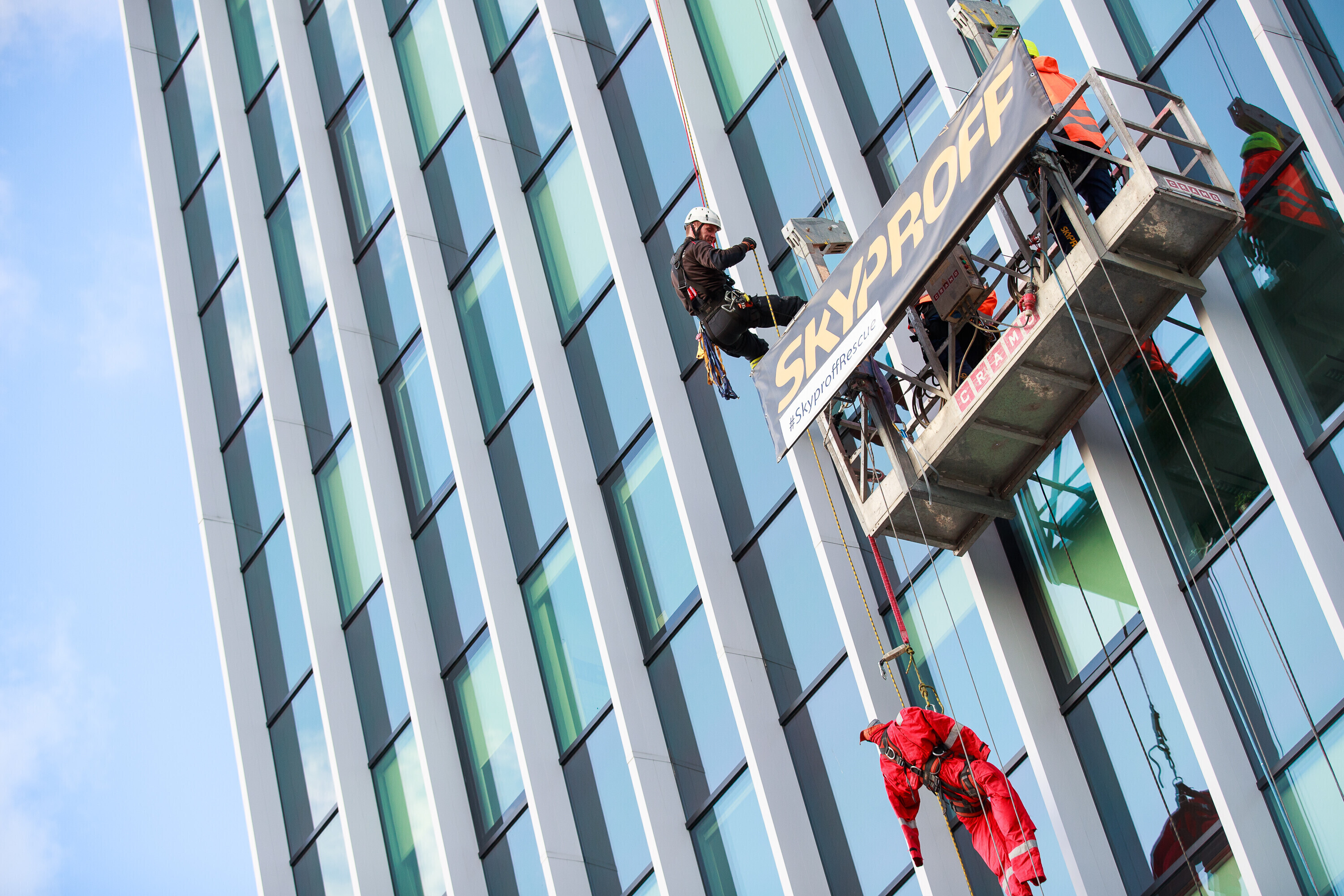 В ходе учений спасатели взбирались и спускались по фасаду радиодома и отрабатывали навыки спасения на высоте на манекене, изображавшем нуждавшегося в помощи.