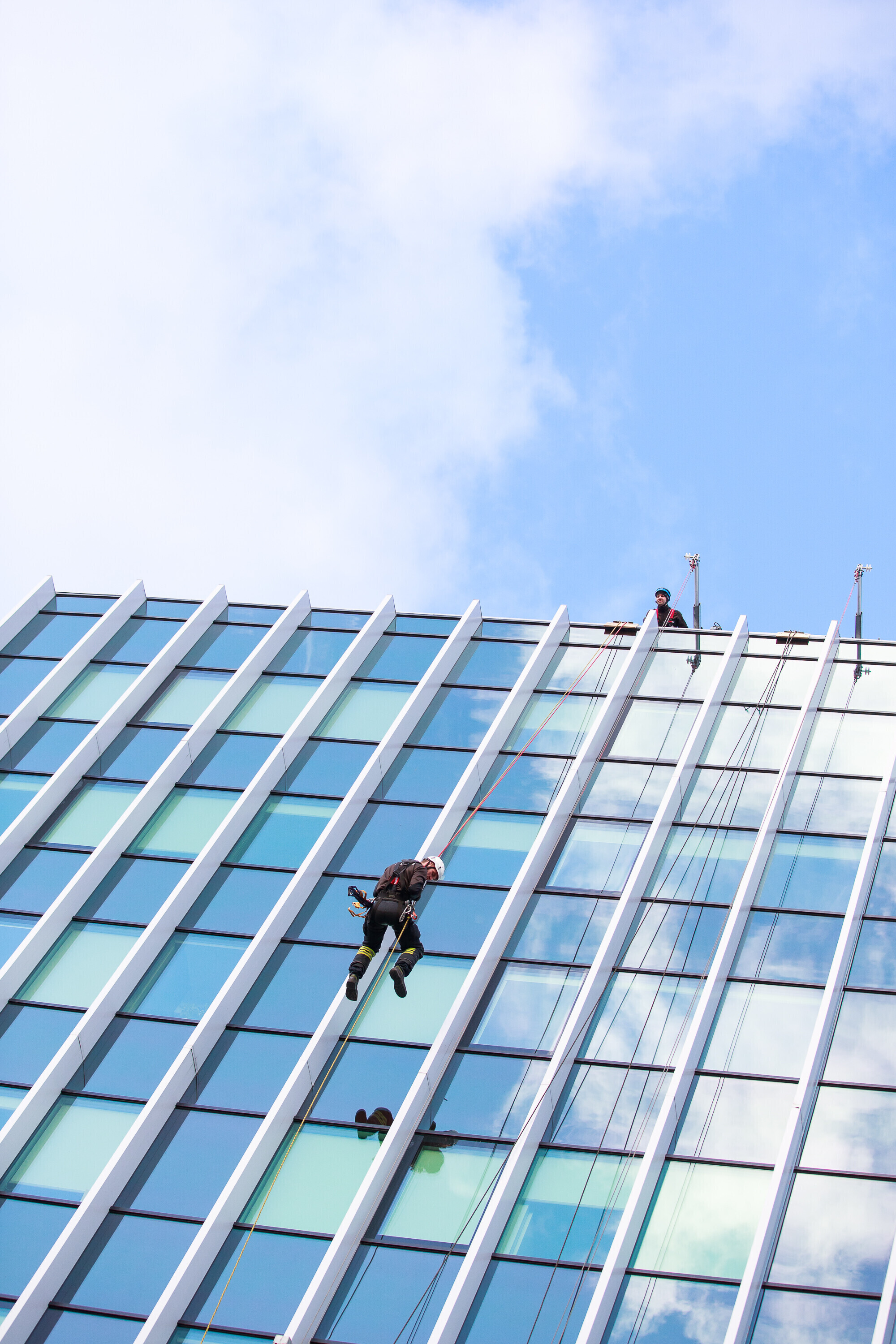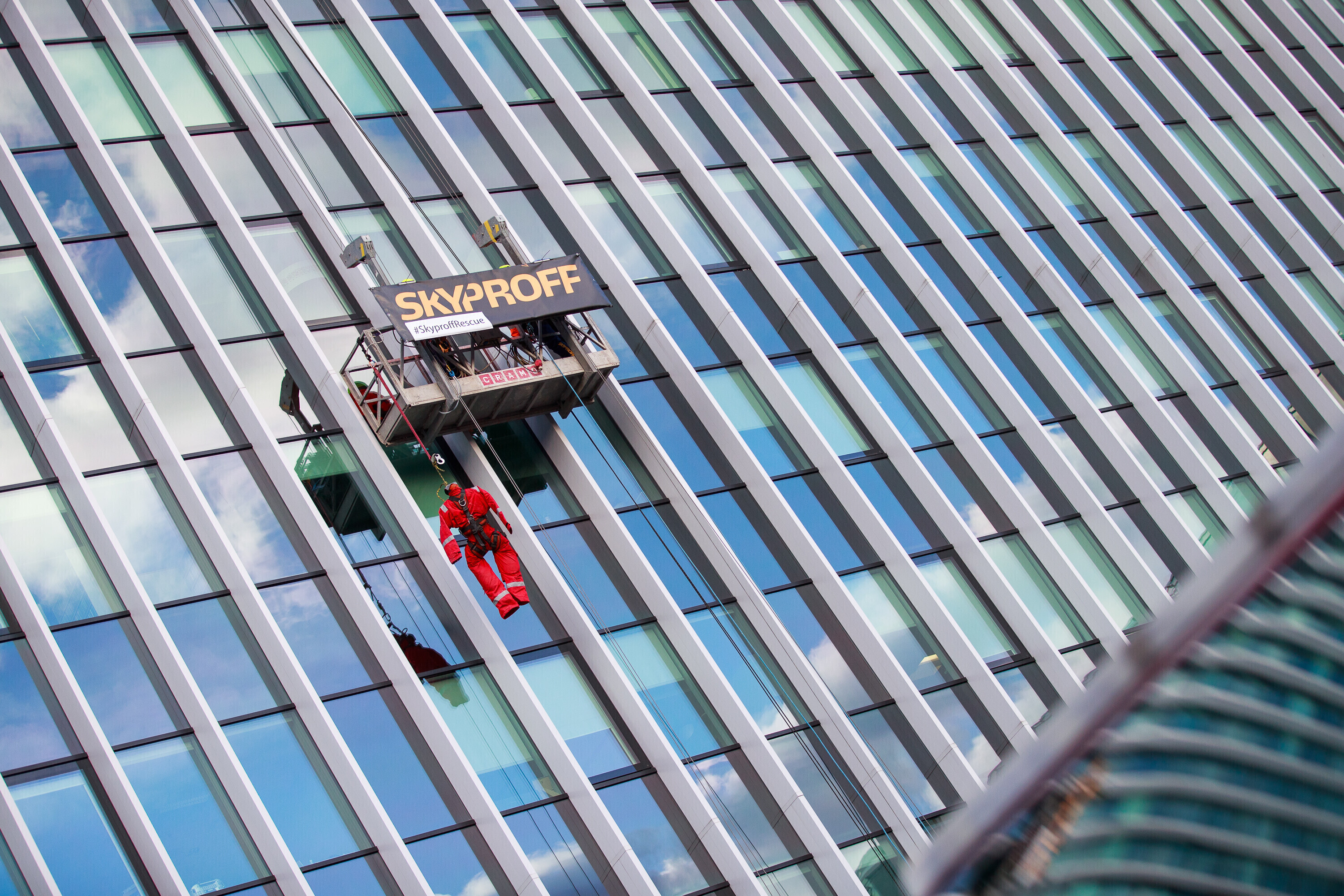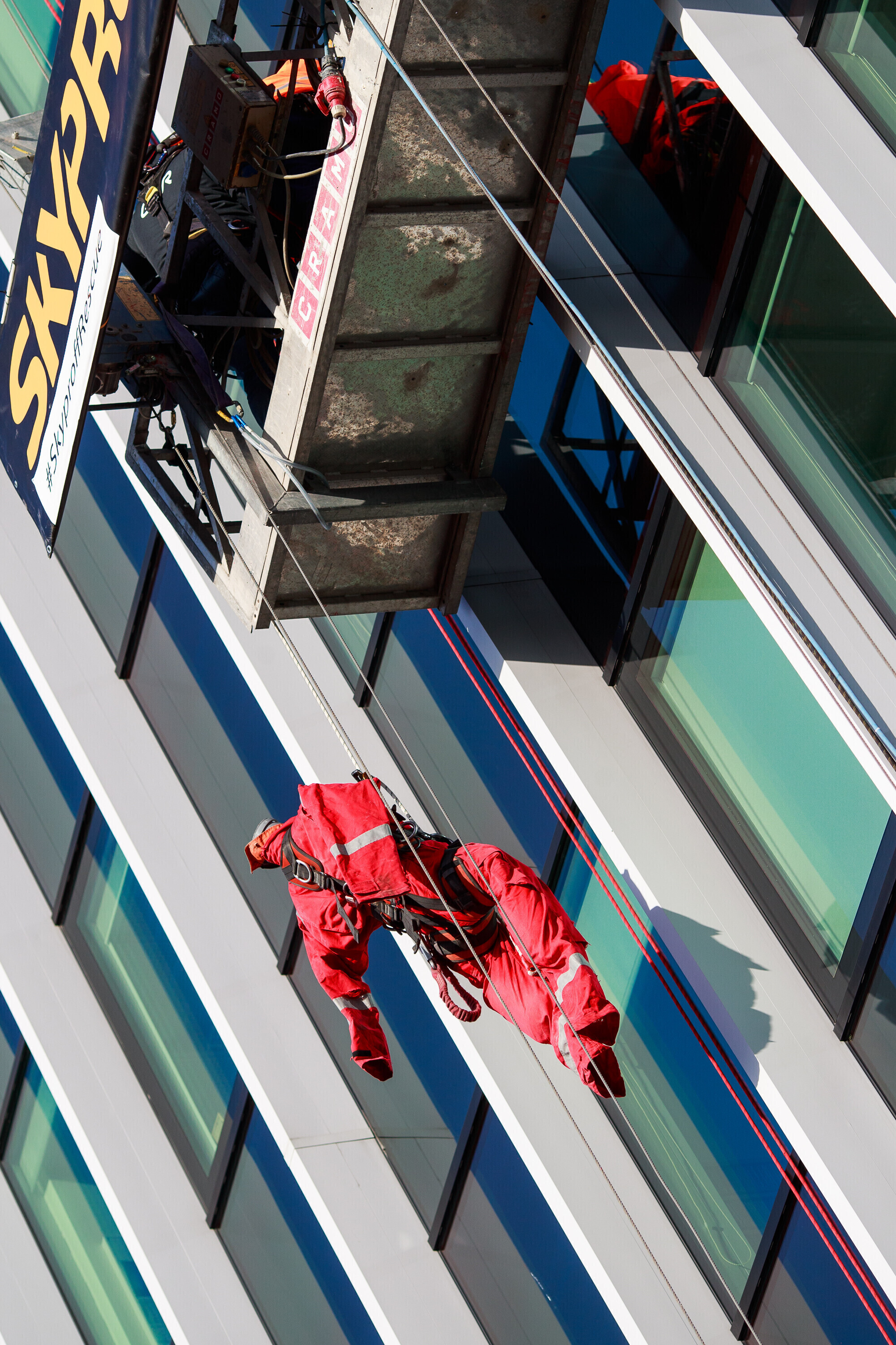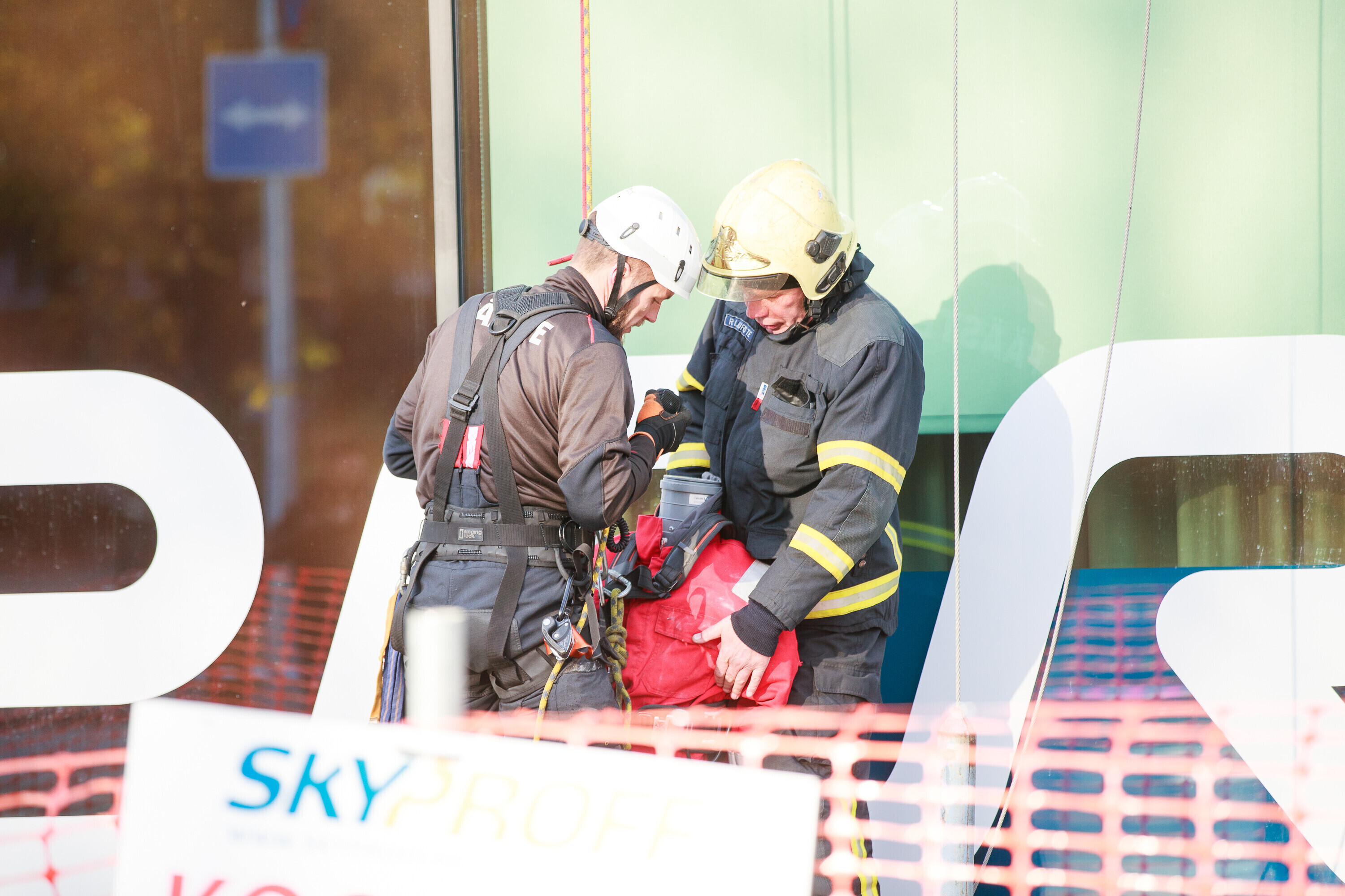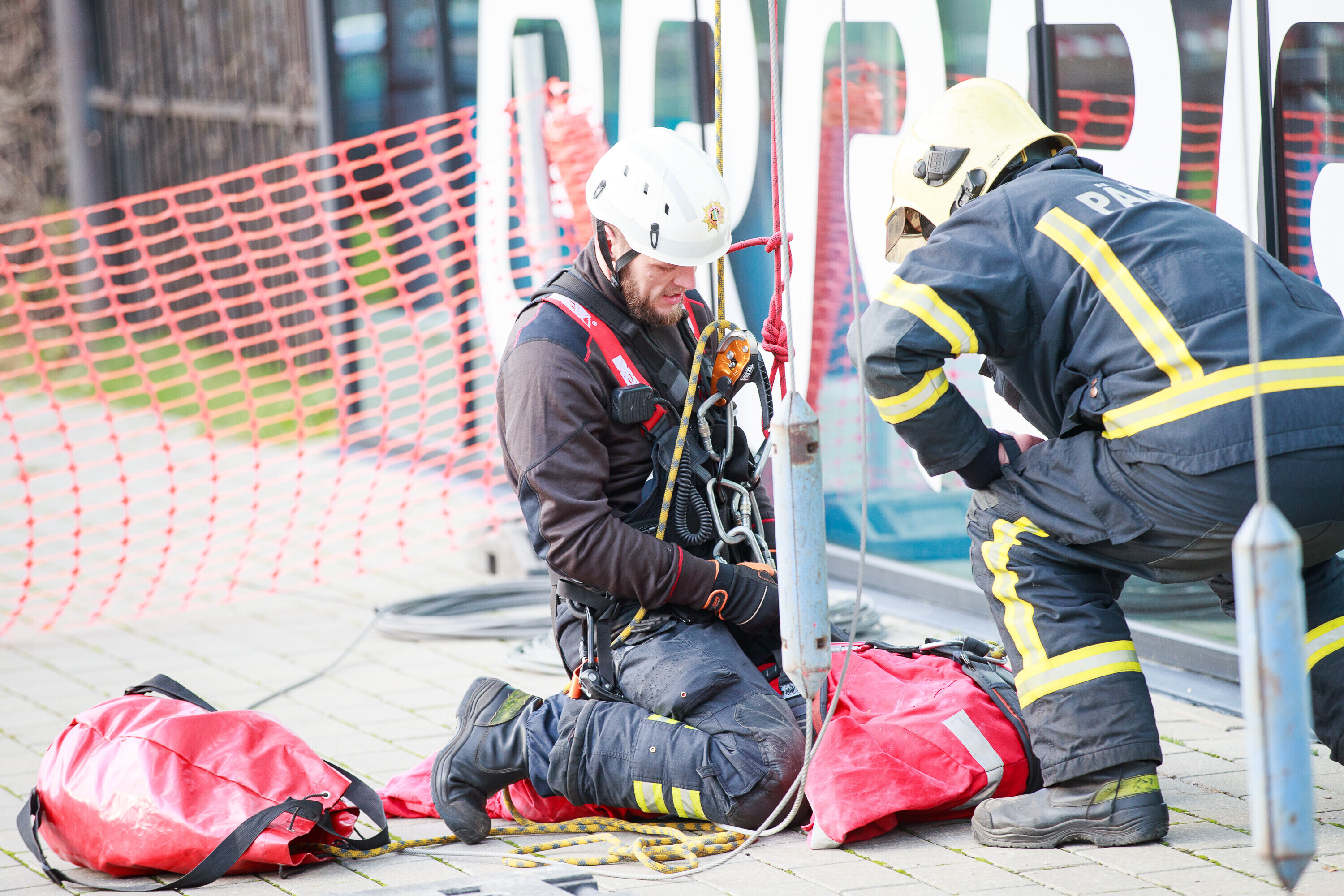 В ходе учений спасатели взбирались и спускались по фасаду радиодома и отрабатывали навыки спасения на высоте на манекене, изображавшем нуждавшегося в помощи.